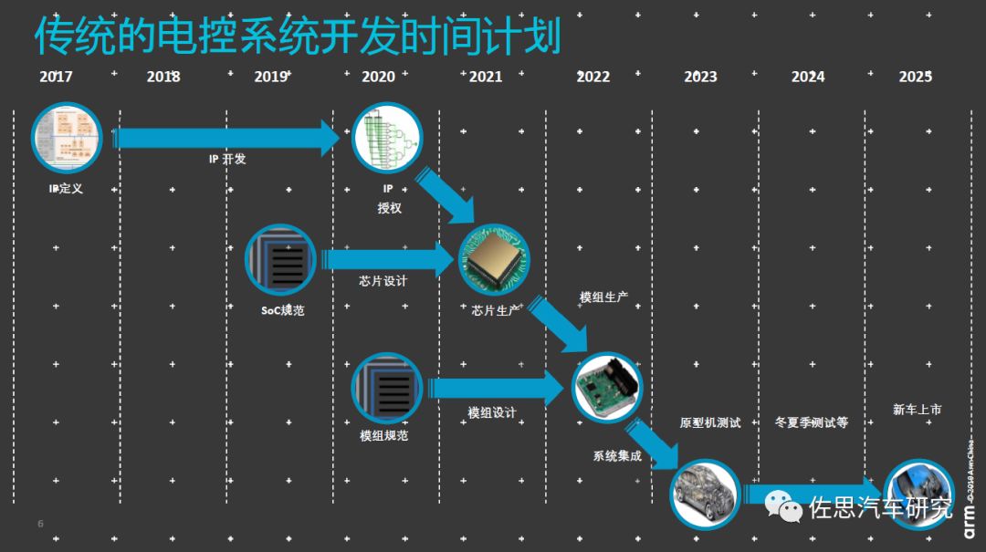 ARM的IP从开发到上市需要一定的时间。从2017年定义IP开始, 开发IP需要两到三年时间,然后把IP产品授权给合作方将IP做成芯片,再做测试,最后到车上市,这个周期可能有六到七年,甚至七到八年。现在大家使用的很多ARM架构的芯片,它们的IP其实很早就开发出来了。由于周期特别长,ARM需要提前和合作伙伴、一级供应商以及车厂进行交流,这样才能保证最终的IP的适用性。