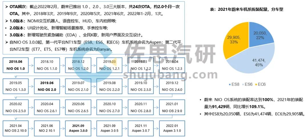 几乎每年进行一次系统大升级,如NIO OS 2.0 (2019.06)、Aspen 3.0(2021.09)。