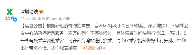 根据新冠疫情防控需要,自2022年8月20日10时起,深圳地铁1、5号线宝安中心站暂停运营服务,双方向列车不停站通过,具体恢复时间待另行通知。