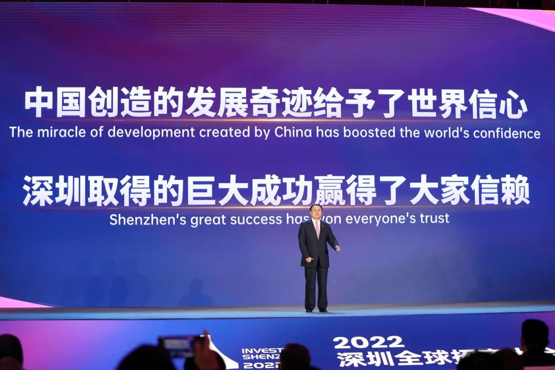 他说,今天我们举办全球招商大会,是对过去42年来广大企业为深圳高速发展所作贡献的致敬,也是对全市今年招商成果的检验和展示,更是面向未来奋力前行的郑重宣示,宣示深圳重商亲商的鲜明态度,宣示深圳面向全球招商引资、招才引智的满腔热情,宣示深圳坚定不移推动高质量发展的决心信心。