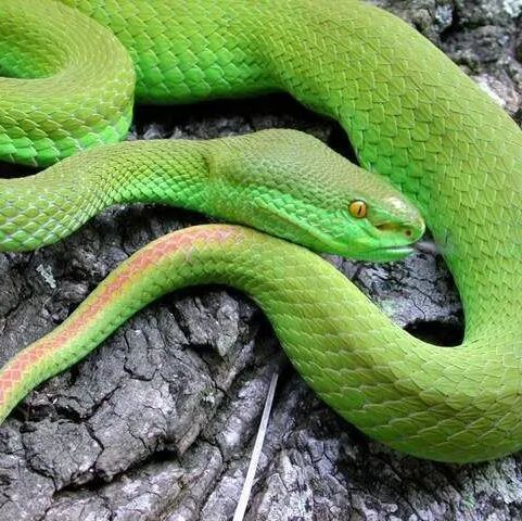 竹叶青特征:竹叶青蛇常吊挂或缠在树枝上,全身翠绿,眼睛多数为黄色或者红色,瞳孔呈垂直的一条线,尾巴焦红色。