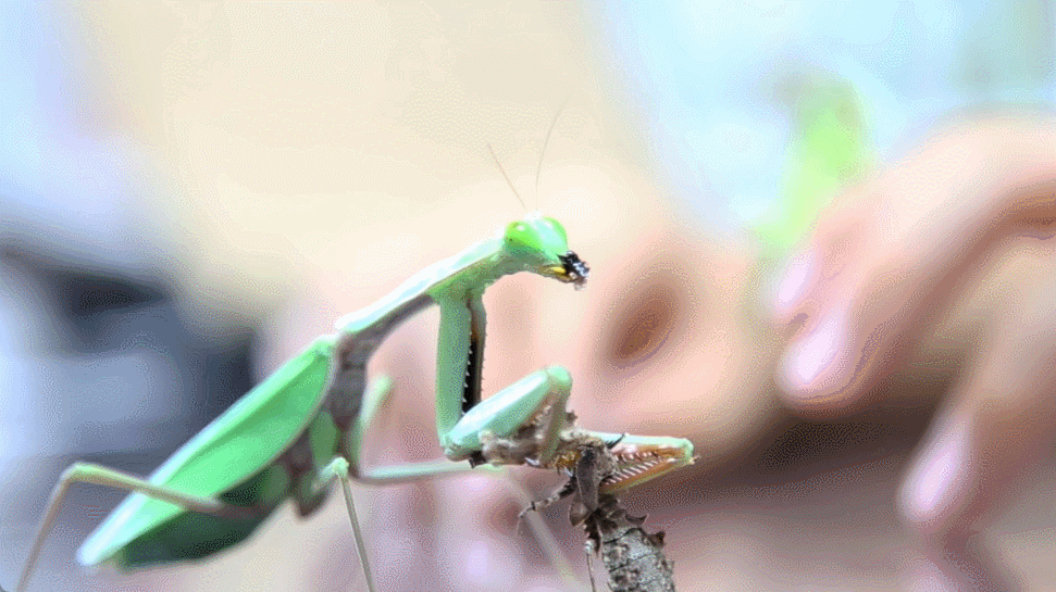 采访时,就在柒柒介绍最喜欢的一只中南拟睫螳螂时,旁边的澳洲宽腹螳螂突然发起攻击捕获中南拟睫螳螂,并在众目睽睽之下享用“午餐”。