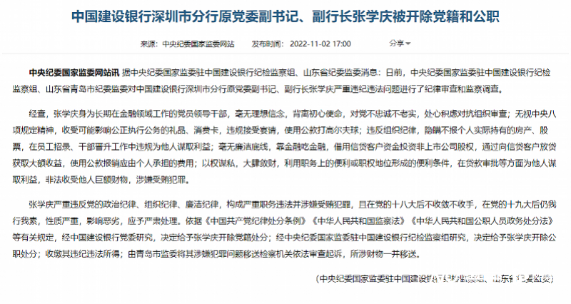 11月2日,中纪委官网显示,日前,中央纪委国家监委驻中国建设银行纪检监察组、山东省青岛市纪委监委对中国建设银行深圳市分行原党委副书记、副行长张学庆严重违纪违法问题进行了纪律审查和监察调查。