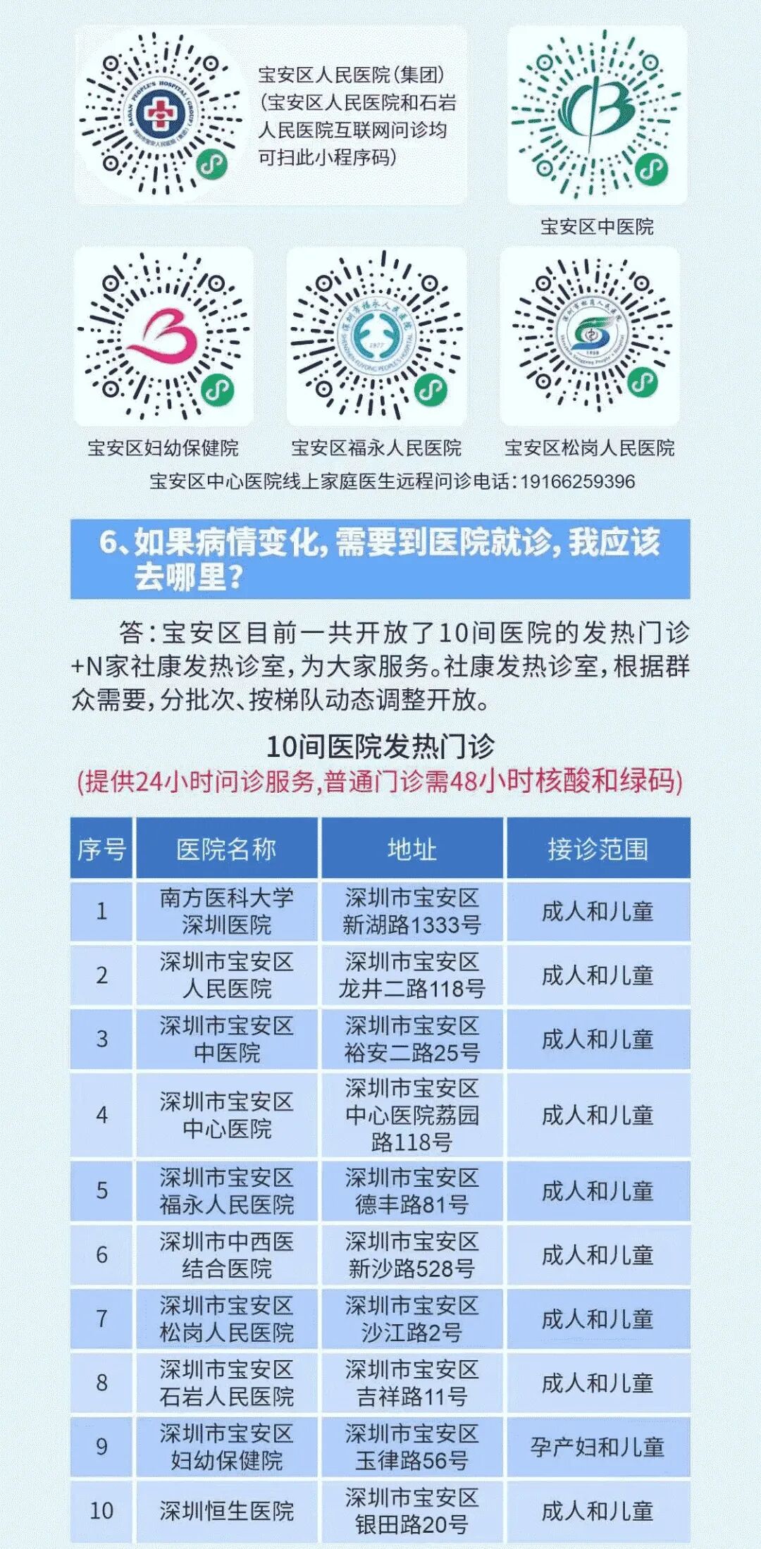 最近,宝安区7家医院通过互联网医院平台或专用家庭医生服务热线正式开通“新冠问诊”专门通道。同时,10间医院开放发热门诊,开放18家社区健康服务中心发热诊室作为第一批接收发热、乏力、腹泻、咽痛等“十大症状”患者的社康机构,患者可前往就医。