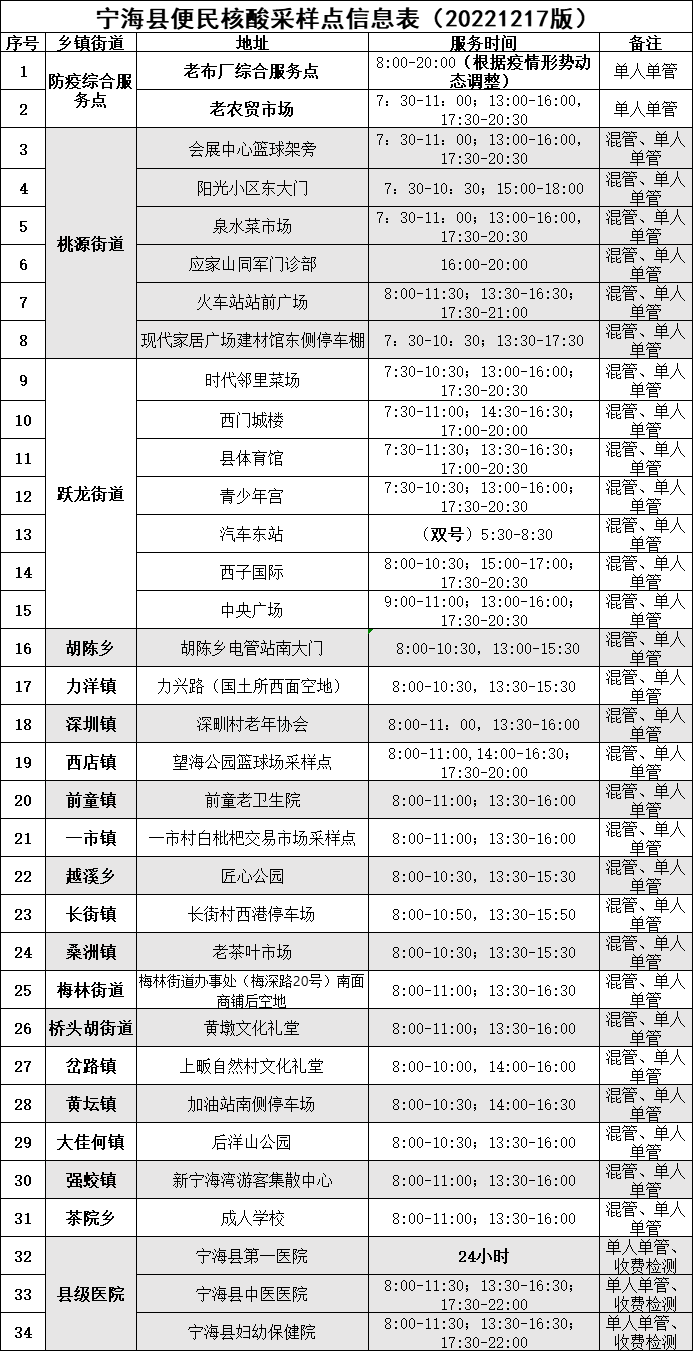 根据疫情新的变化趋势,从12月17日起,宁海县就现有核酸采样点作进一步调整,最新采样点安排如下: