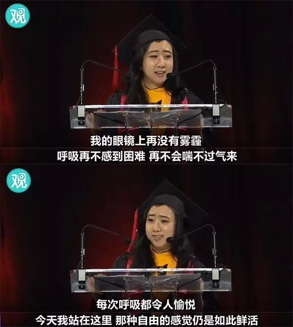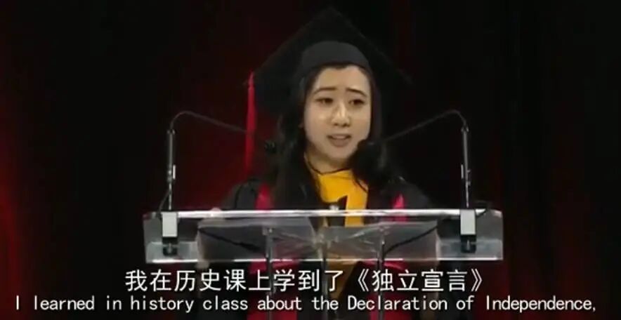 说特朗普之前,我们先来回忆一下当年著名的“美国空气都香甜”的跪族事件。2017年,在美国马里兰大学的毕业典礼上,一名中国留学生杨舒平,在她的演讲里输出了一堆拜美踩中的言论:无底线谄媚完美国,还要回踩中国,认为“中国空气质量差,必须戴口罩”: