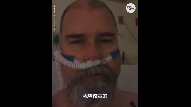 美国德州一名反口罩人士,在2020年年底被感染。他重症濒死时才明白,一定要戴口罩,空气里都是病毒。