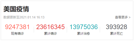 “我学到了自由表达自己的权力,我能挑战自己指导员的观点。”这一番跪族言论,引起了很多反弹,网友纷纷与她理论。她没有任何反思,也觉得自己丝毫没错。并表示自己是美国人,永远不会回到中国。这种行为,就像仰天吐唾沫,总有一天唾沫会落到自己的脸上。她毕业之后在美国找工作,结果四处碰壁。曾经对她抛出过橄榄枝的美国企业最终因为她惹起了巨大争议,而拒绝了她。于是美国人杨舒平背井离乡去了韩国,结果韩国疫情之下也不好就业,无奈之下,她在社交平台表示,自己马上要回中国了:还希望大家不要嫉妒她取得了美国绿卡,嫉妒美国的空气更香甜。杨舒平不一定真的恨国,她谄媚美国,也只是在向美国所代表的象征性献媚,征服美国的绿卡就是为了满足自己的自恋,证明自己是人上人。而今天,我们再来深扒真实的美国,到底是个什么底色。截止到2021年1月14日,美国累计确诊2300万新冠患者,死亡39万人:![]()