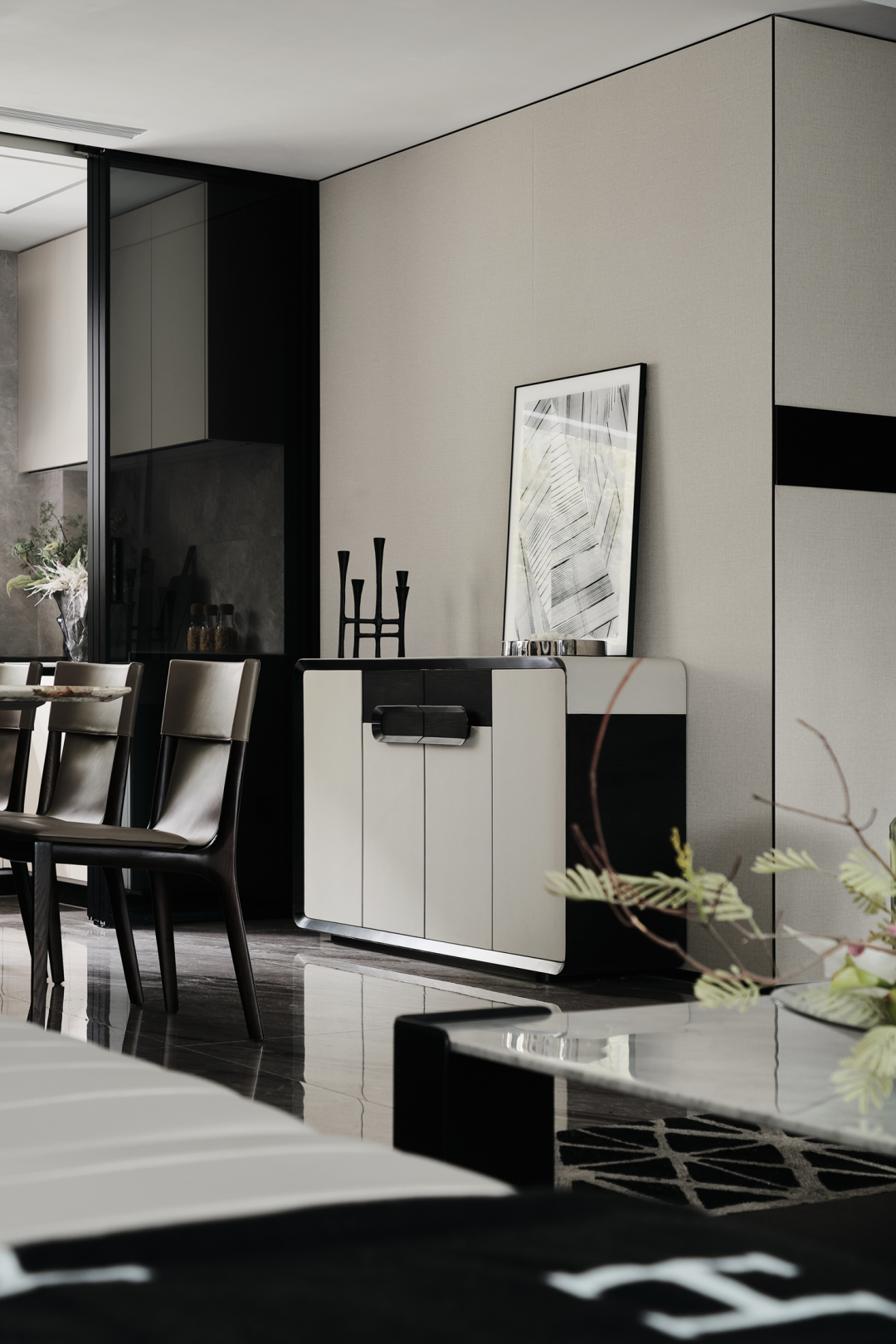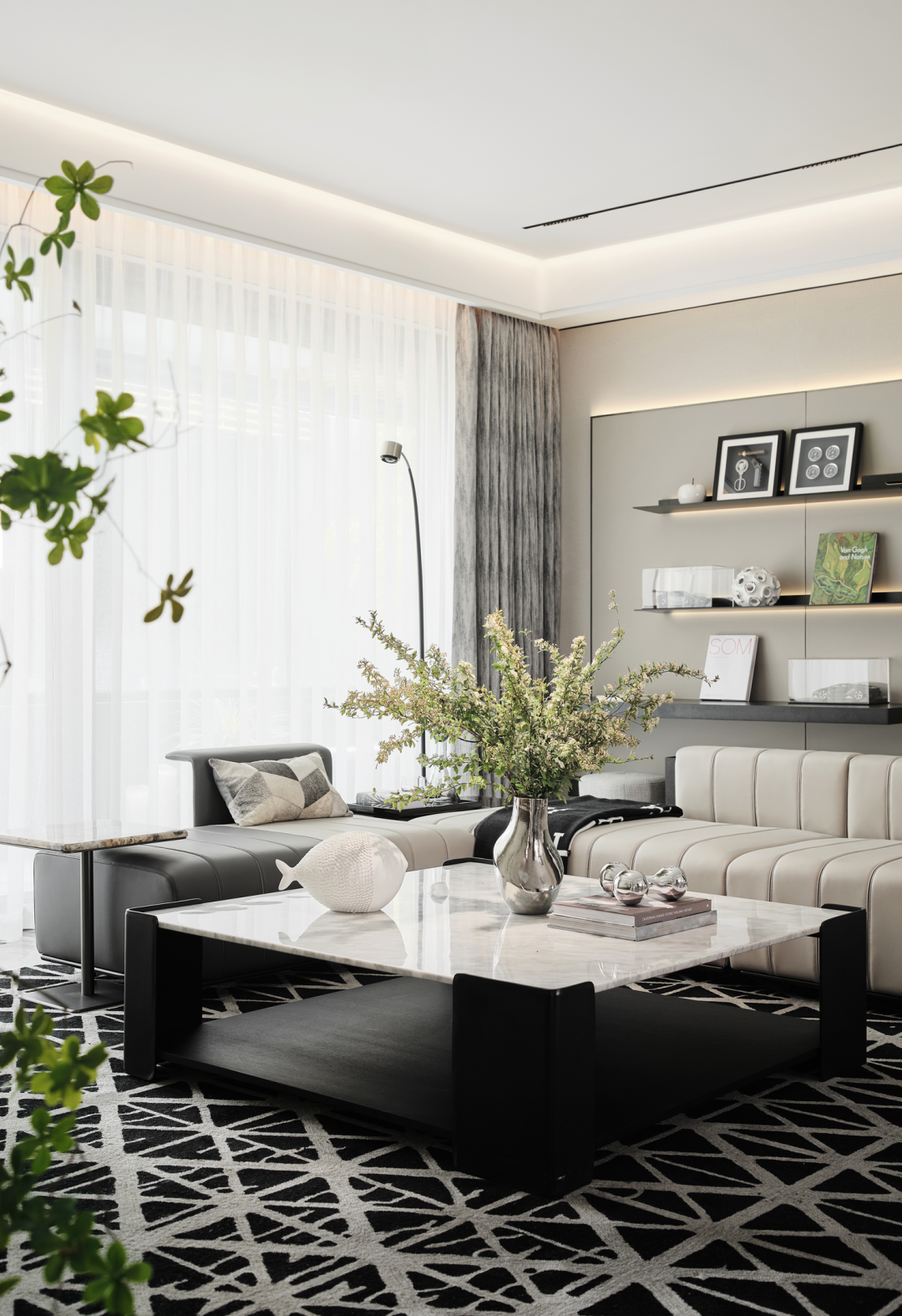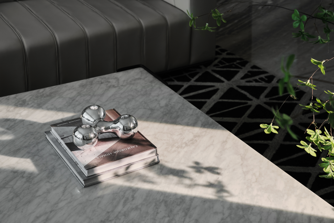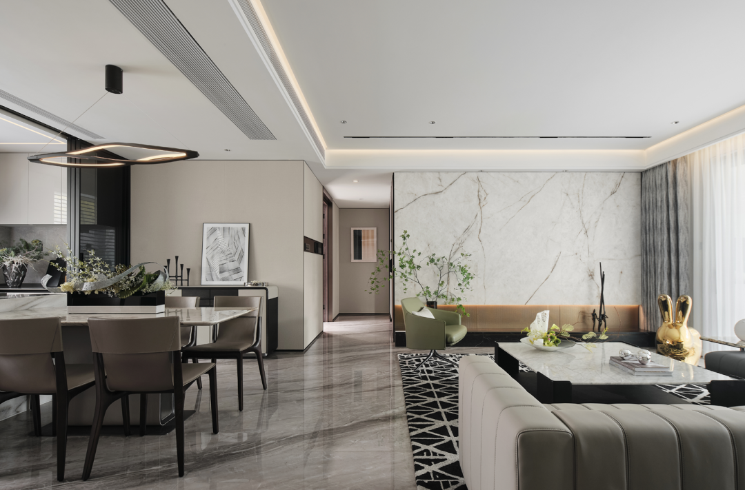 整体空间以低奢美学为主调,采用简约雅致的灰咖、米白为基底,营造宁静简美的空间氛围,经典的黑、白、灰,永不过时,于简约和克制之中呈现大气与高贵;客厅沙发桌椅,优雅舒适,且极富细节品质,加之简洁线条的融入,凝结成无可取代的低奢与精致;皮革、木材、石材等高品质耐久材质的运用,也铸就了与时光应和的基础。不同层次的绿跳跃其中,为空间增添几分“森意”……