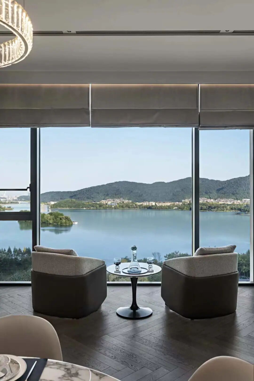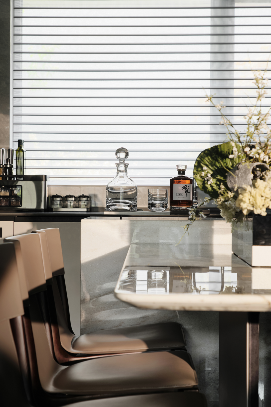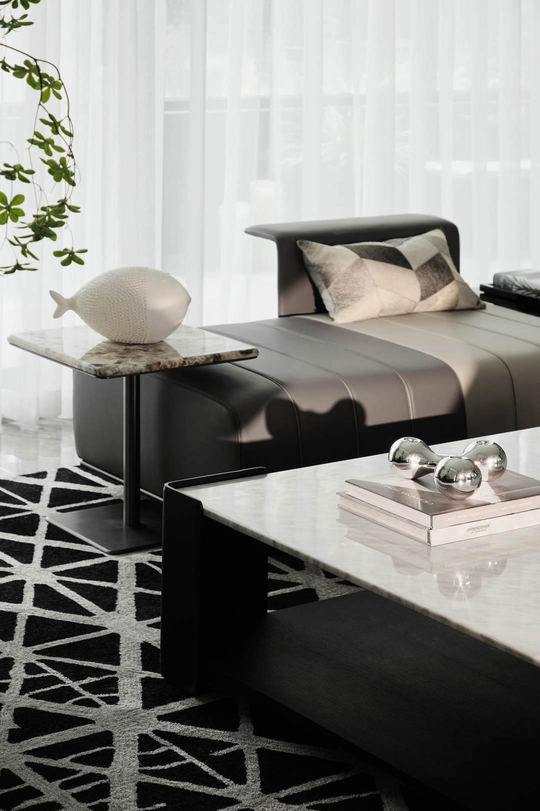 整体空间以低奢美学为主调,采用简约雅致的灰咖、米白为基底,营造宁静简美的空间氛围,经典的黑、白、灰,永不过时,于简约和克制之中呈现大气与高贵;客厅沙发桌椅,优雅舒适,且极富细节品质,加之简洁线条的融入,凝结成无可取代的低奢与精致;皮革、木材、石材等高品质耐久材质的运用,也铸就了与时光应和的基础。不同层次的绿跳跃其中,为空间增添几分“森意”……