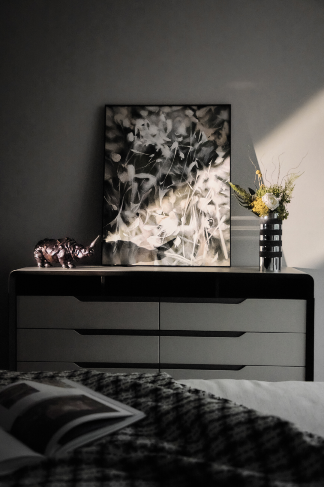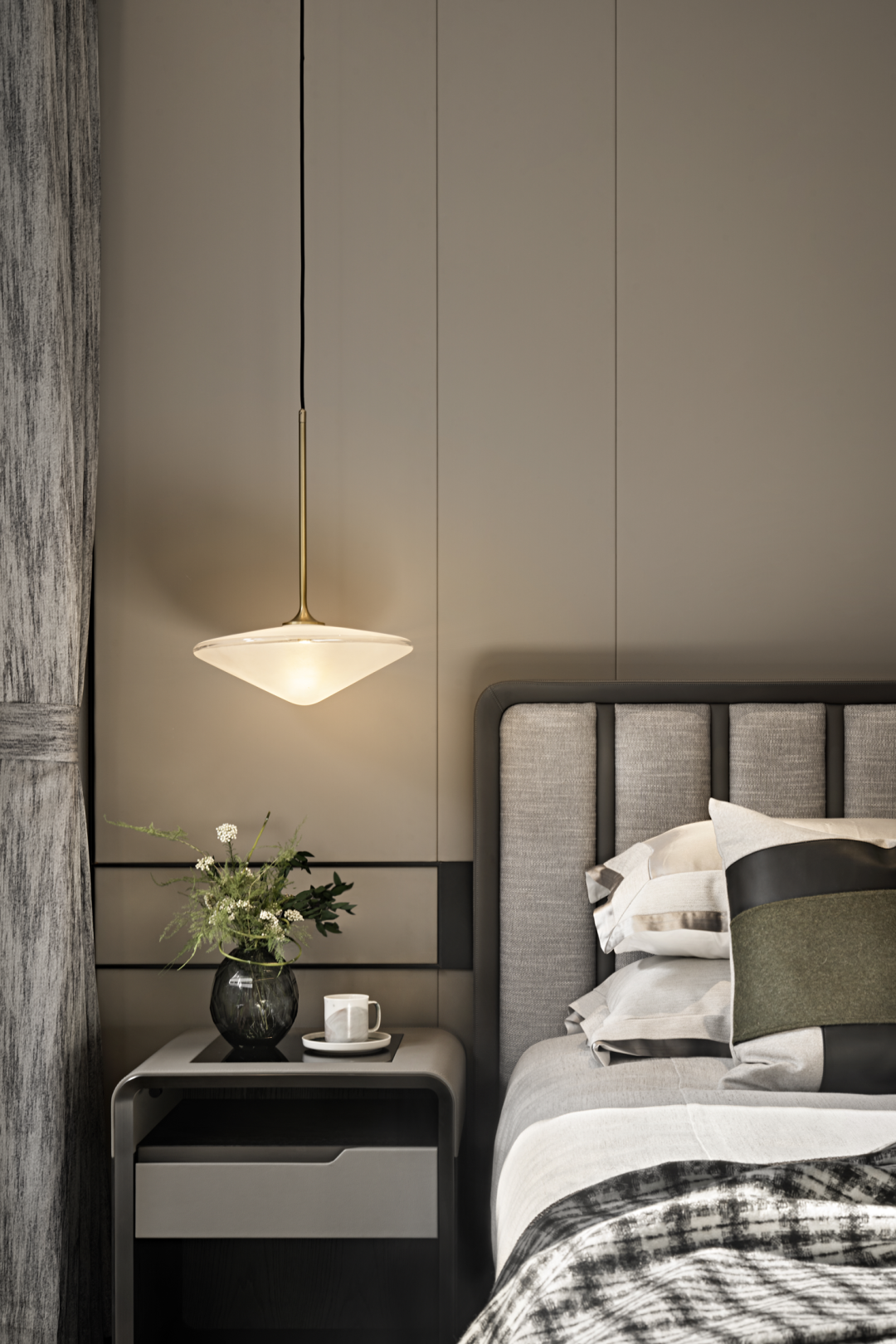 墙壁上的艺术挂画,边桌上的俏皮摆件,角落里的清新绿意,床头精致灯具散发出的盈盈微光,温柔了空间与时间,为空间注入思想与灵魂,增添了空间的格调与品位。