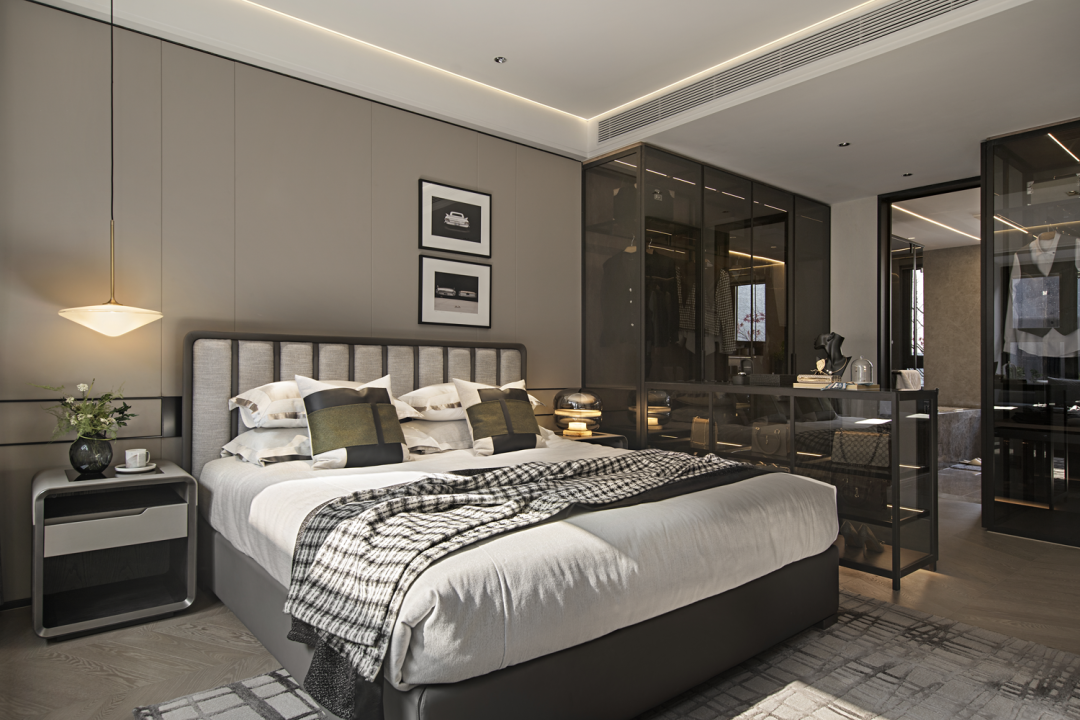 主卧空间的体验营造,融入了顶级奢华酒店的功能与细节,私密、宁静、优雅,描摹出精致的慵懒。大尺度步入式衣帽间、高级感卫浴、干湿分区设计,是品质生活的必备。