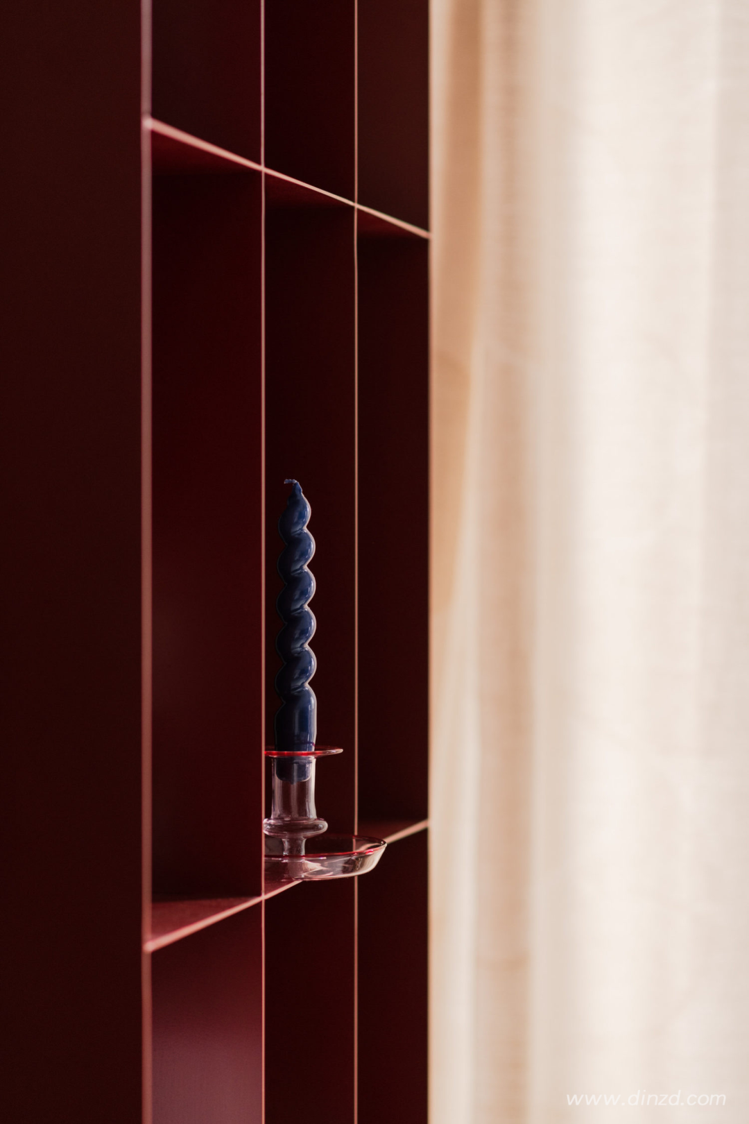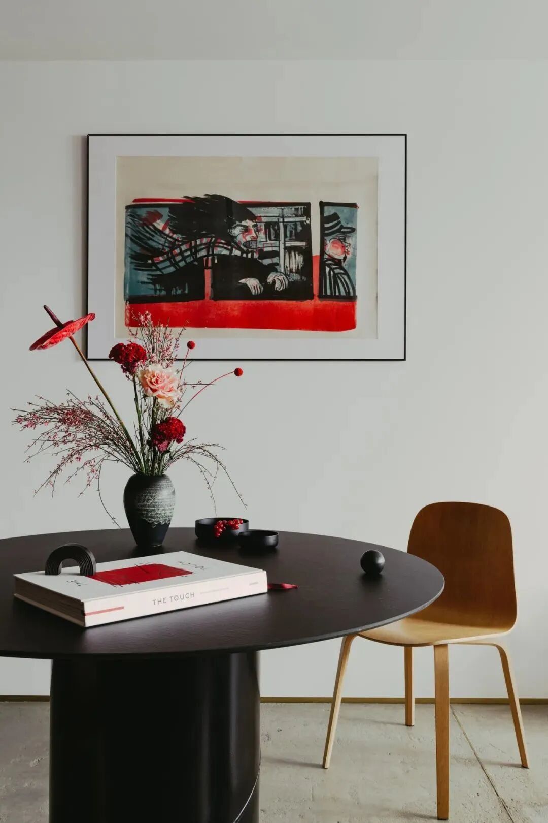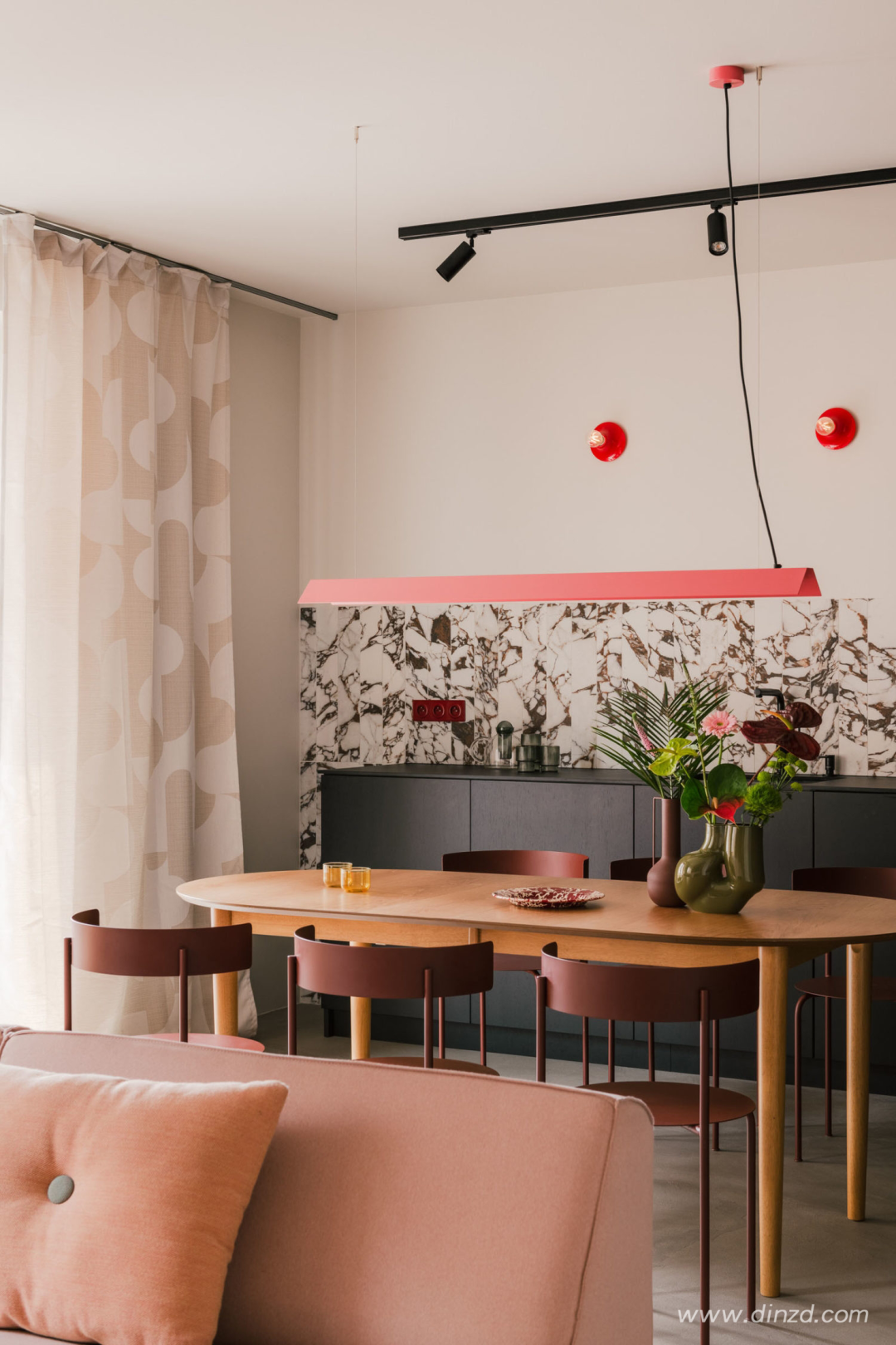 The raw microcement floor used throughout has been paired with the deep, matte veneered kitchen cupboards and the warmth of the walnut wood furniture in the living room. “Those dominating elements contrast with colourful accents added with a trace of humour,” explain the designers. “The red bookcase made of powder-coated steel and maroon Meadow chairs by The Good Living are a tribute to the building’s colour palette”.