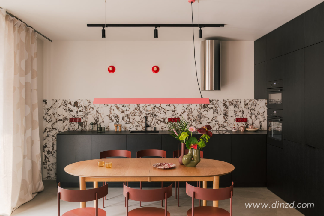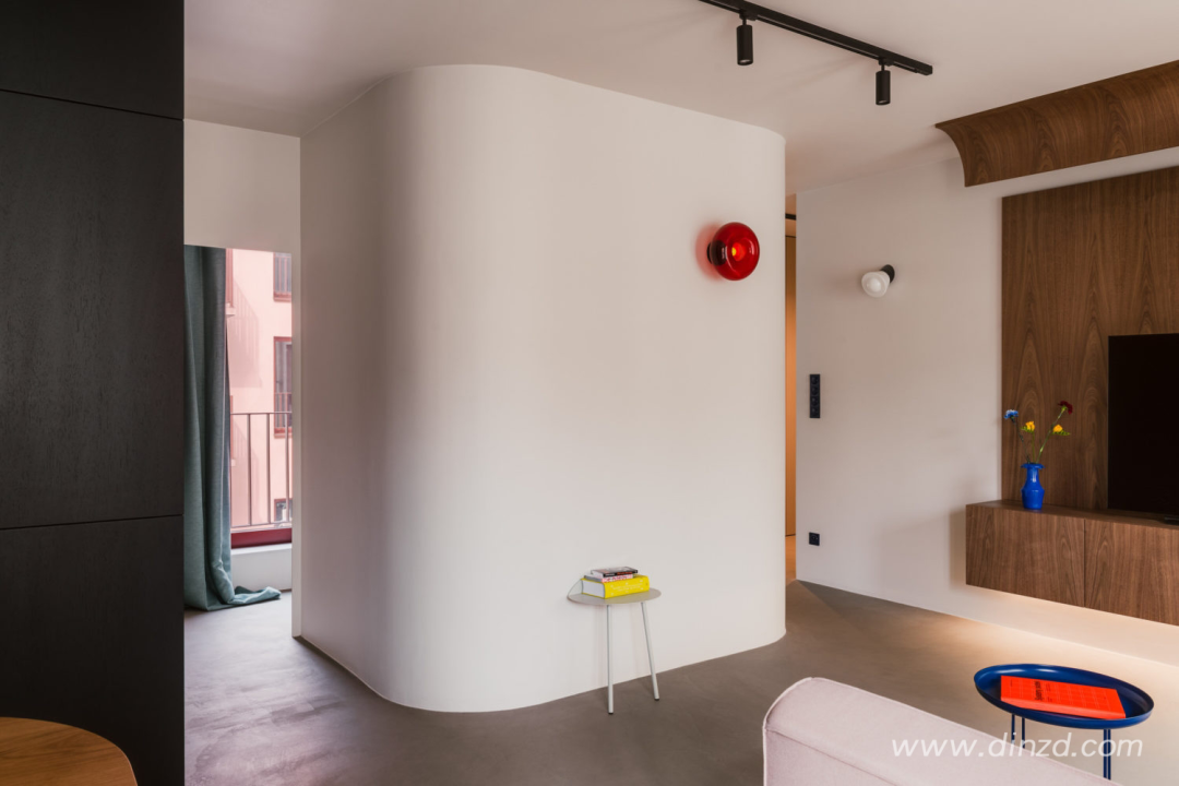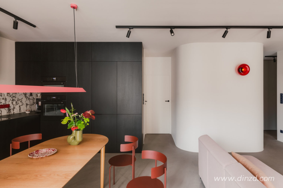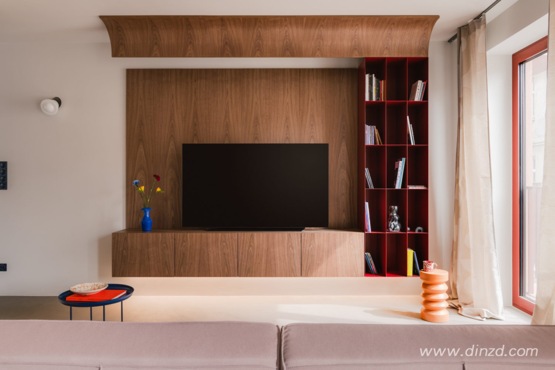 整体使用微水泥地板、哑光橱柜和胡桃木家具的温暖搭配。设计师解释说:“鲜艳的色彩形成对比,为空间添加了一丝幽默感。”粉状涂层钢制成的红色书柜和《美好生活》中的红色坐椅的运用,是对这栋建筑色彩的一次致敬”。