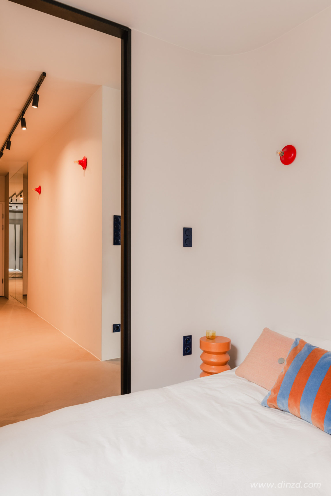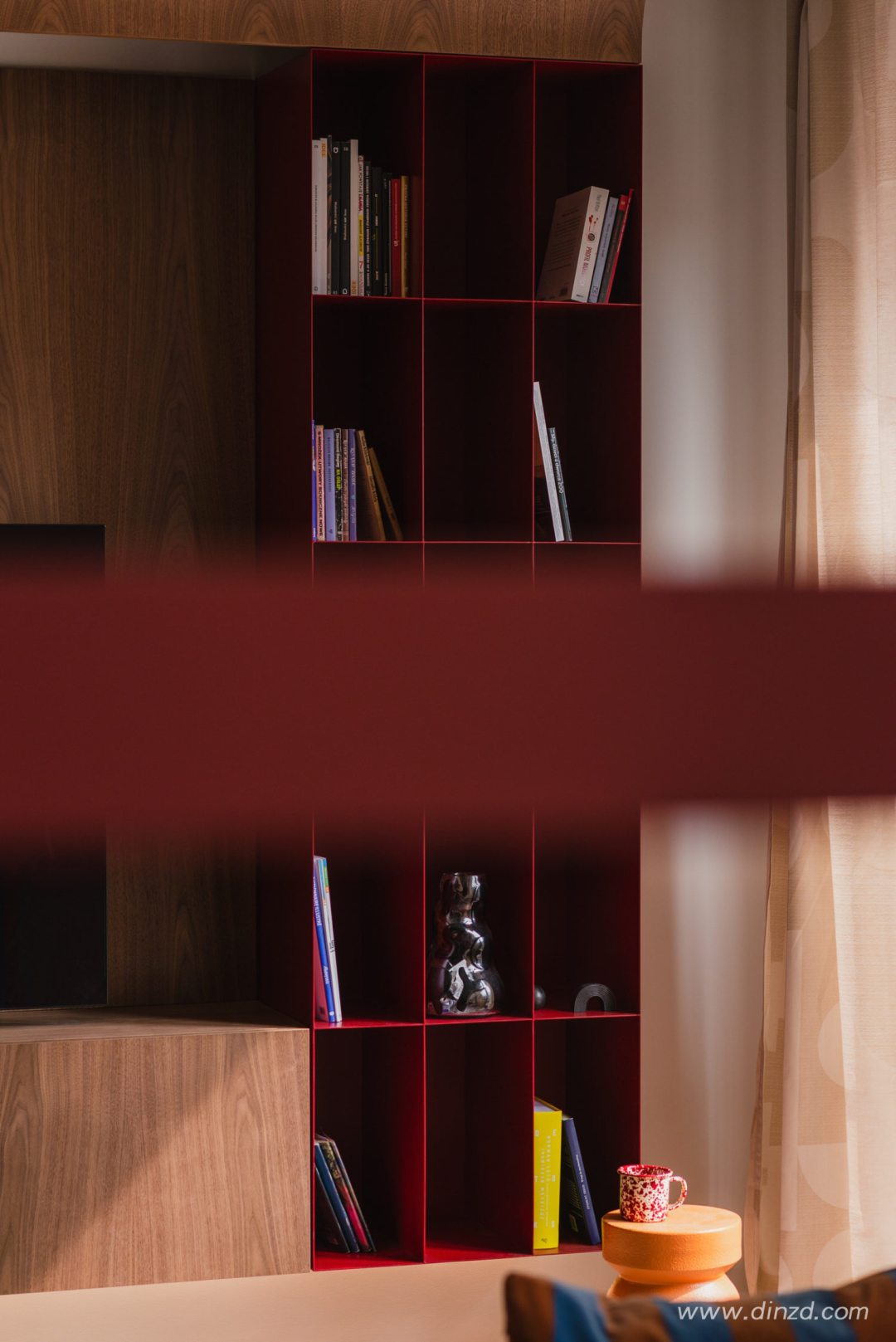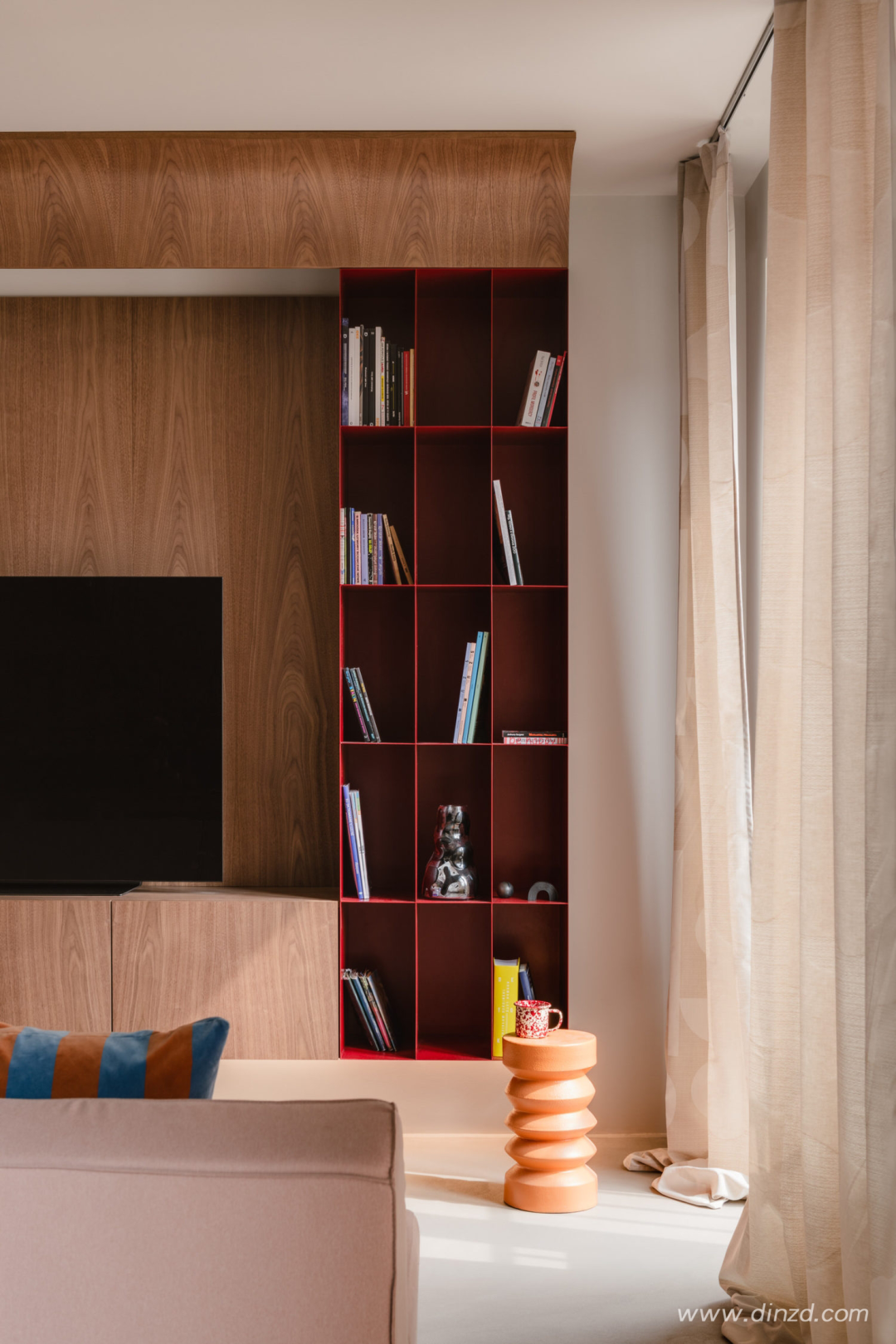 整体使用微水泥地板、哑光橱柜和胡桃木家具的温暖搭配。设计师解释说:“鲜艳的色彩形成对比,为空间添加了一丝幽默感。”粉状涂层钢制成的红色书柜和《美好生活》中的红色坐椅的运用,是对这栋建筑色彩的一次致敬”。