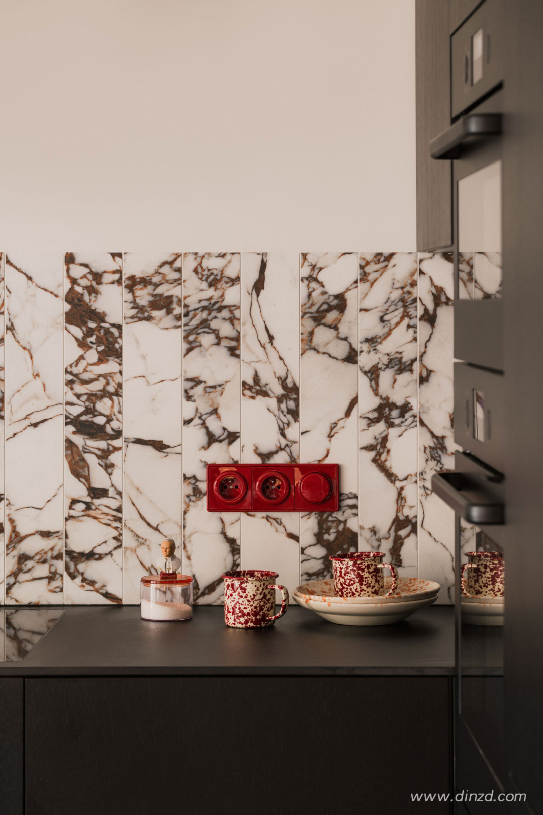 In the kitchen, rather than overhead cupboards, all the storage space can be found to the side to extend that sense of openness. The black, block-like kitchen furniture creates a suitable background for the marble tiles by the Italian brand 41zero42 and the intensely red accents in the form of shiny switches from the GIRA S-Color series, and simple sconces.