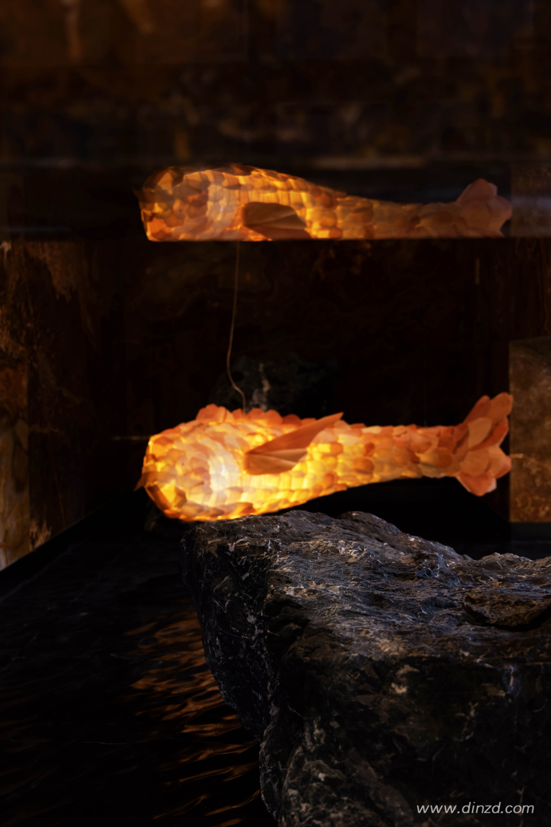 一方水土养一方人,无锡包容温和的水文化深印在人们的内心深处。以苏州太湖石为灵感,提炼、变形,组合出了一个层次丰富且极具雕塑感的造型体。选用了富有张力的红色系纹理玉石,在进入大厅时产生强烈的视觉冲击感。