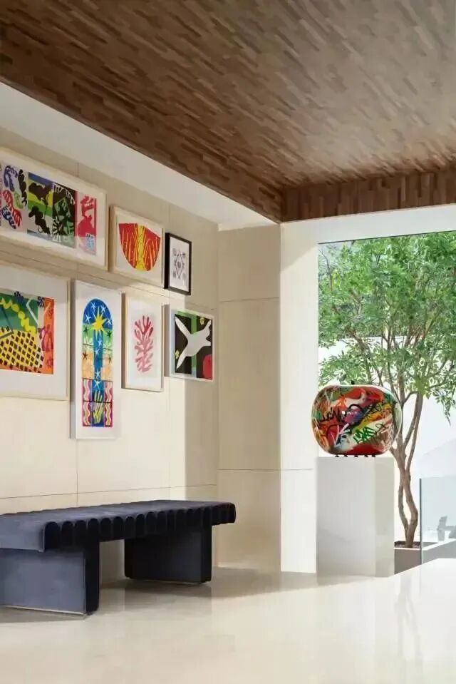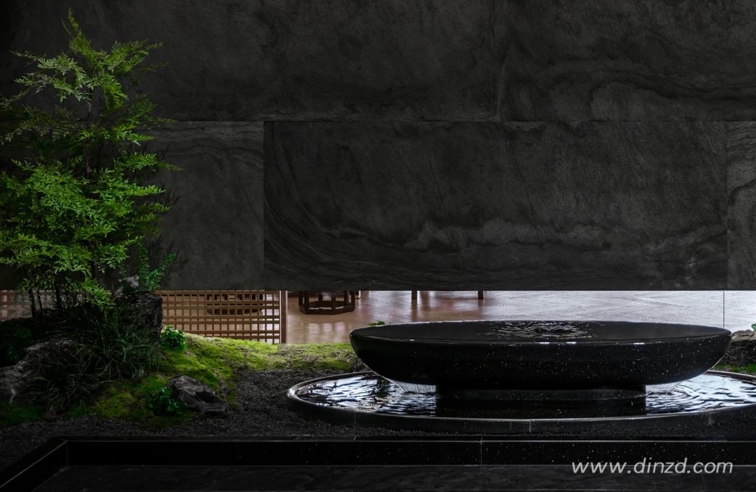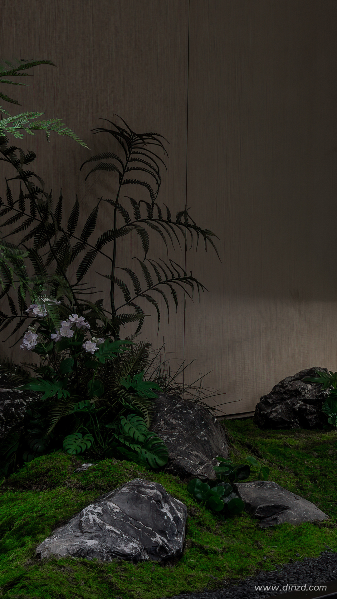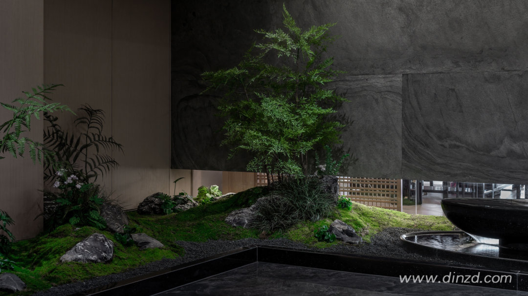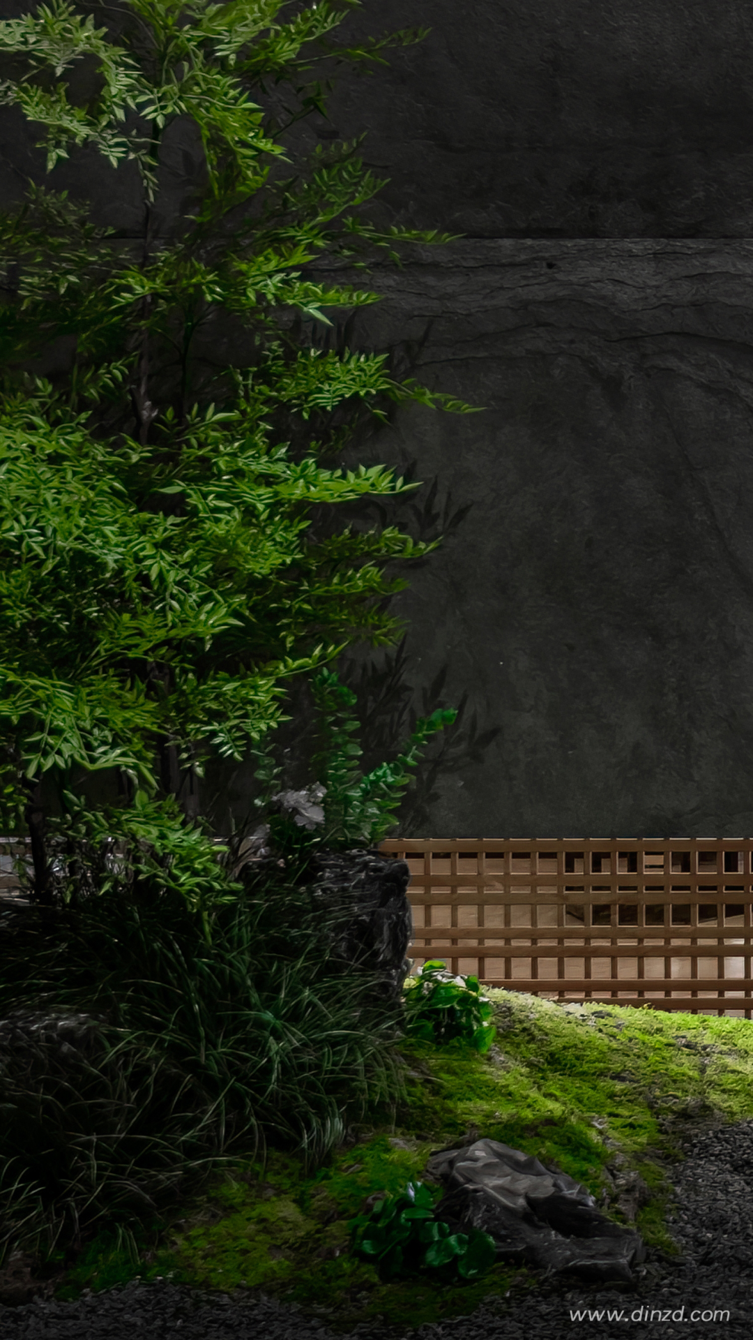 把镜头拉远,起伏的苔藓山丘、潺潺的清流曲水,无不渲染于门框之中,构成一幅立体的、多维的生动场景。一个”品“字道出主人家的审美志趣。