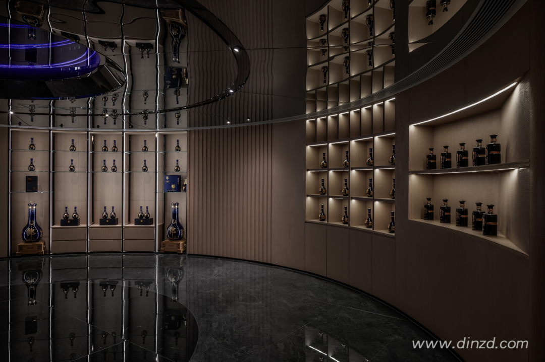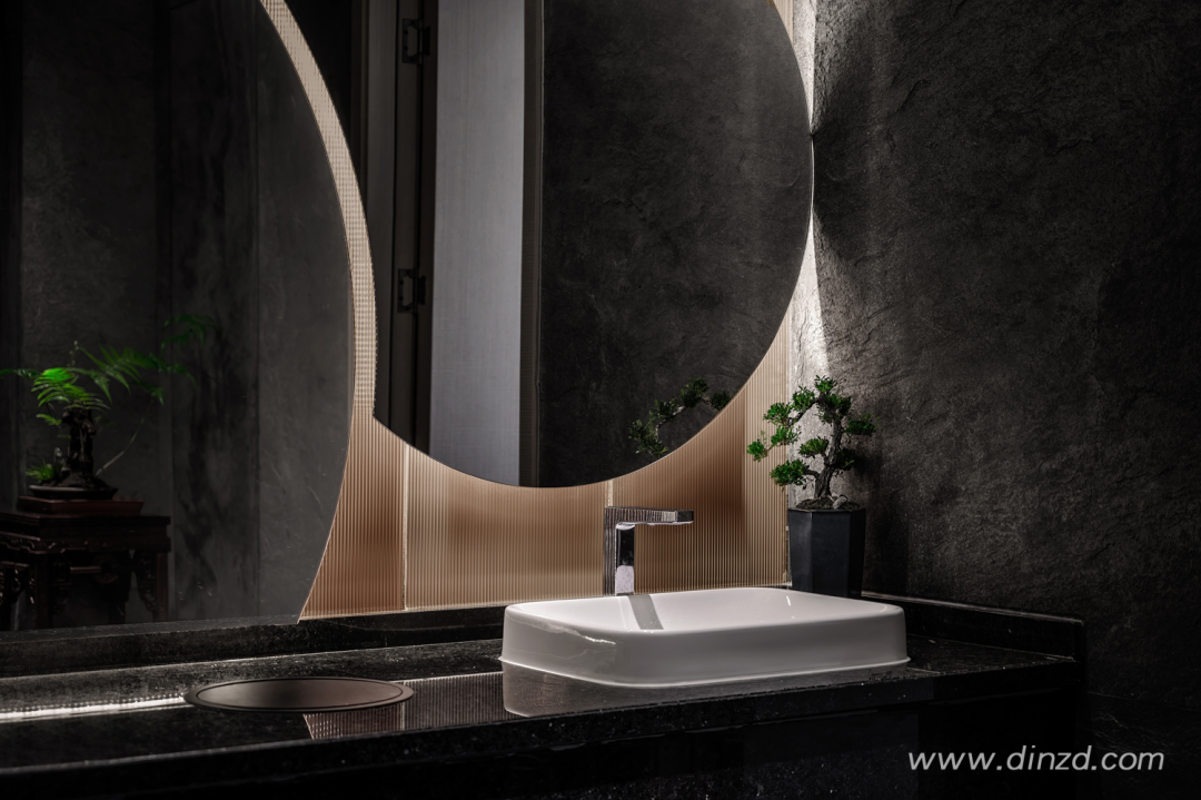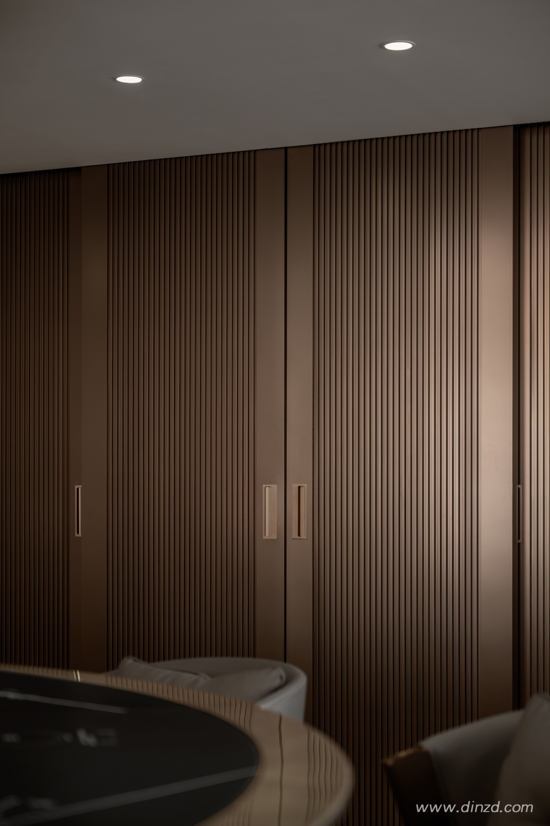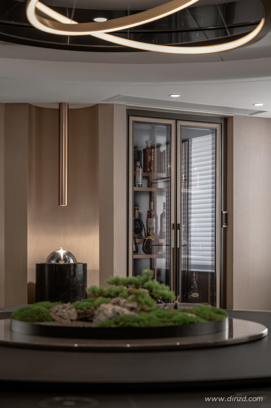 天花,是空间的重要局部,也具有情境营造的特质。在空间中,设计师用”无限镜“代替传统的造型天花,改变了空间纵宽比例的同时,也使空间呈现丰富生动的变化,一圈圈脉脉展开的灯光设计,如涟漪,衍生出重复、节奏、深远的意境联想。