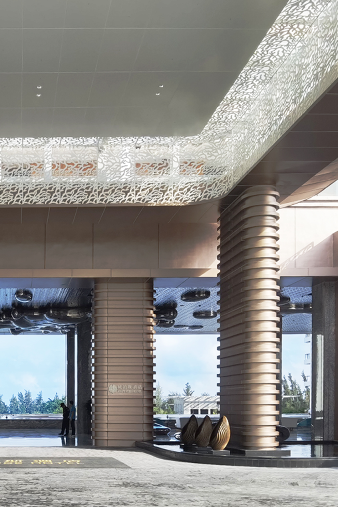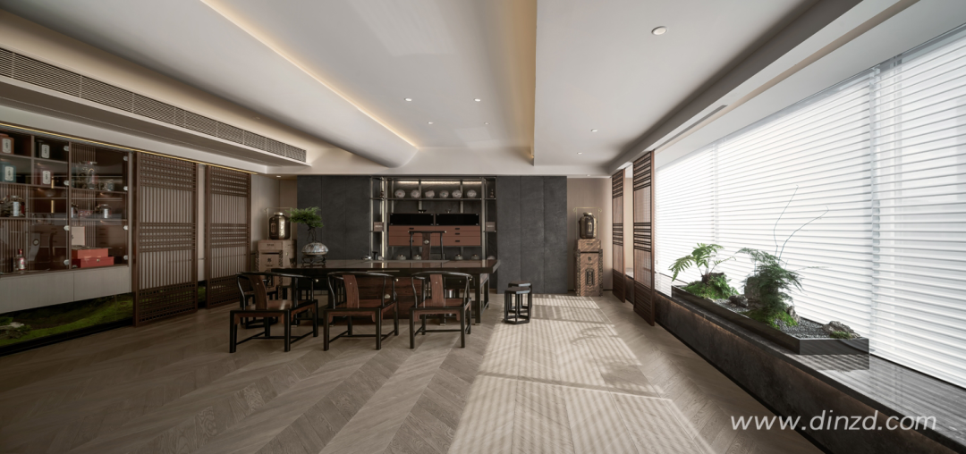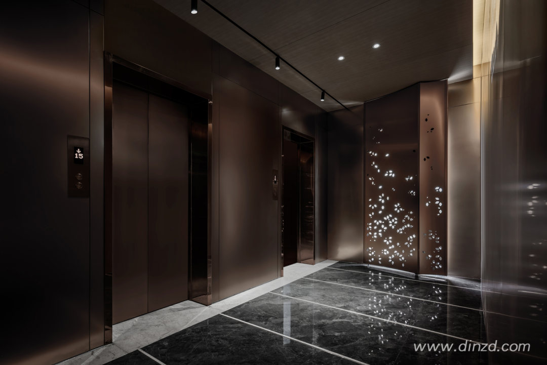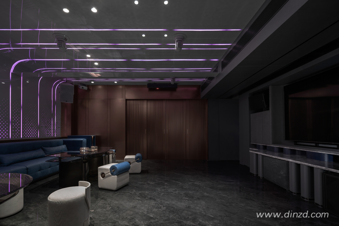 天花,是空间的重要局部,也具有情境营造的特质。在空间中,设计师用”无限镜“代替传统的造型天花,改变了空间纵宽比例的同时,也使空间呈现丰富生动的变化,一圈圈脉脉展开的灯光设计,如涟漪,衍生出重复、节奏、深远的意境联想。