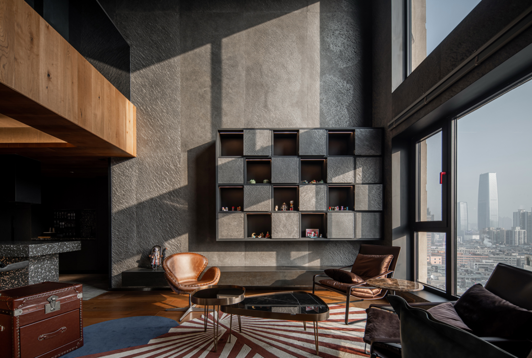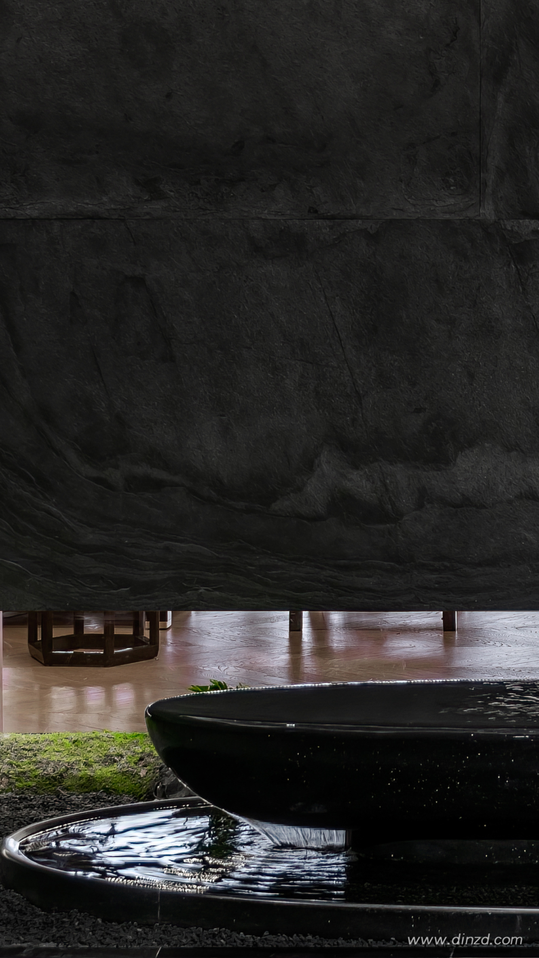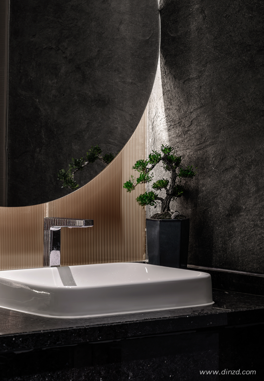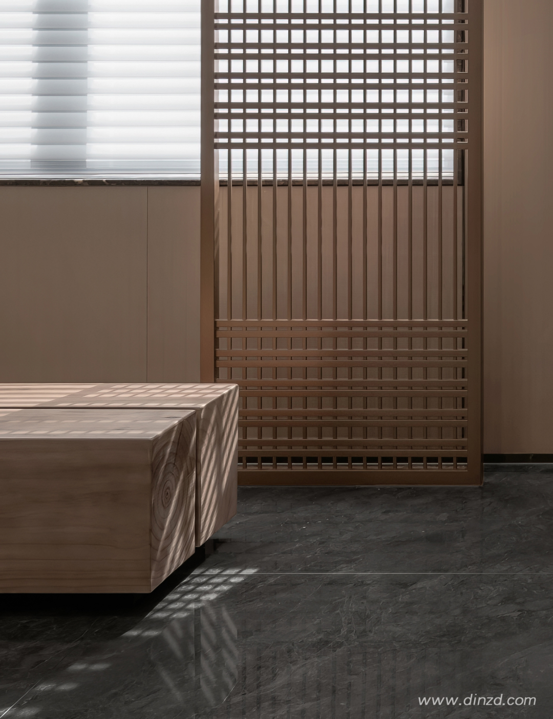 低调亚光的石材与朴实无华的木色构成硬朗与柔软的肌理对比。光线渗透入内,弥漫一室柔和细腻,散发出阴翳之美。