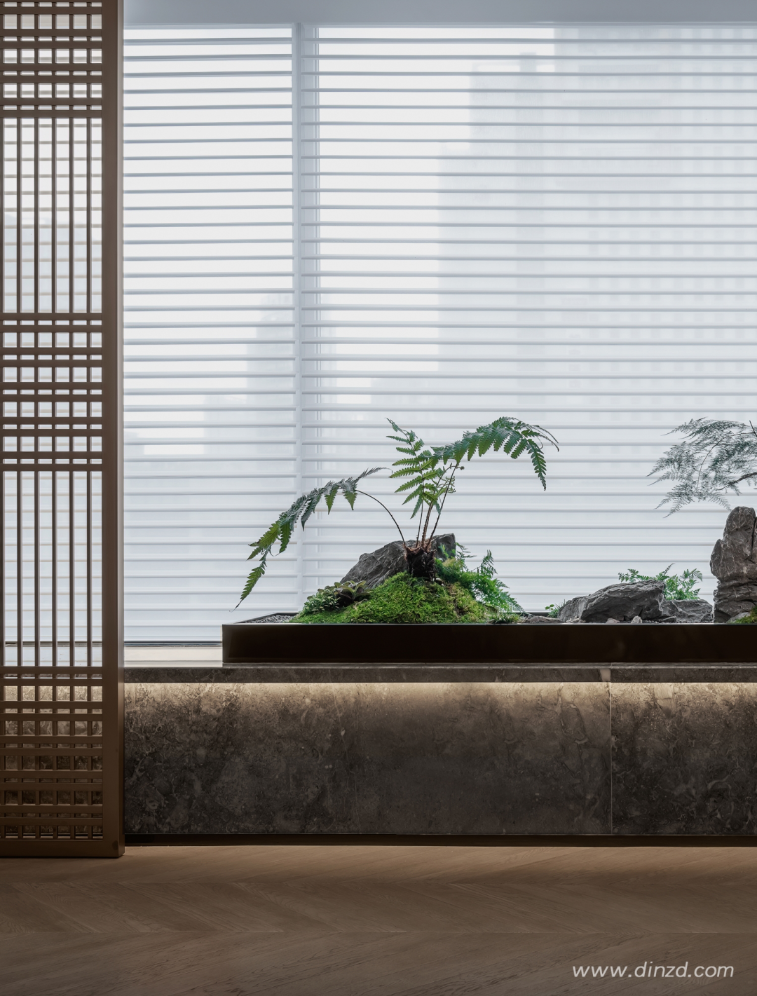 设计师把间隔墙打造成视觉的聚焦点。近观,草铺汀步、错落绿植,是一方安宁从容的天地。