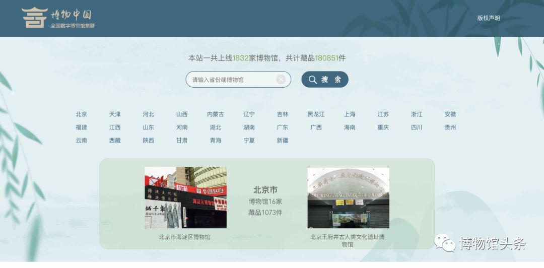 截至目前,本站一共上线1832家博物馆,共计藏品180851件。