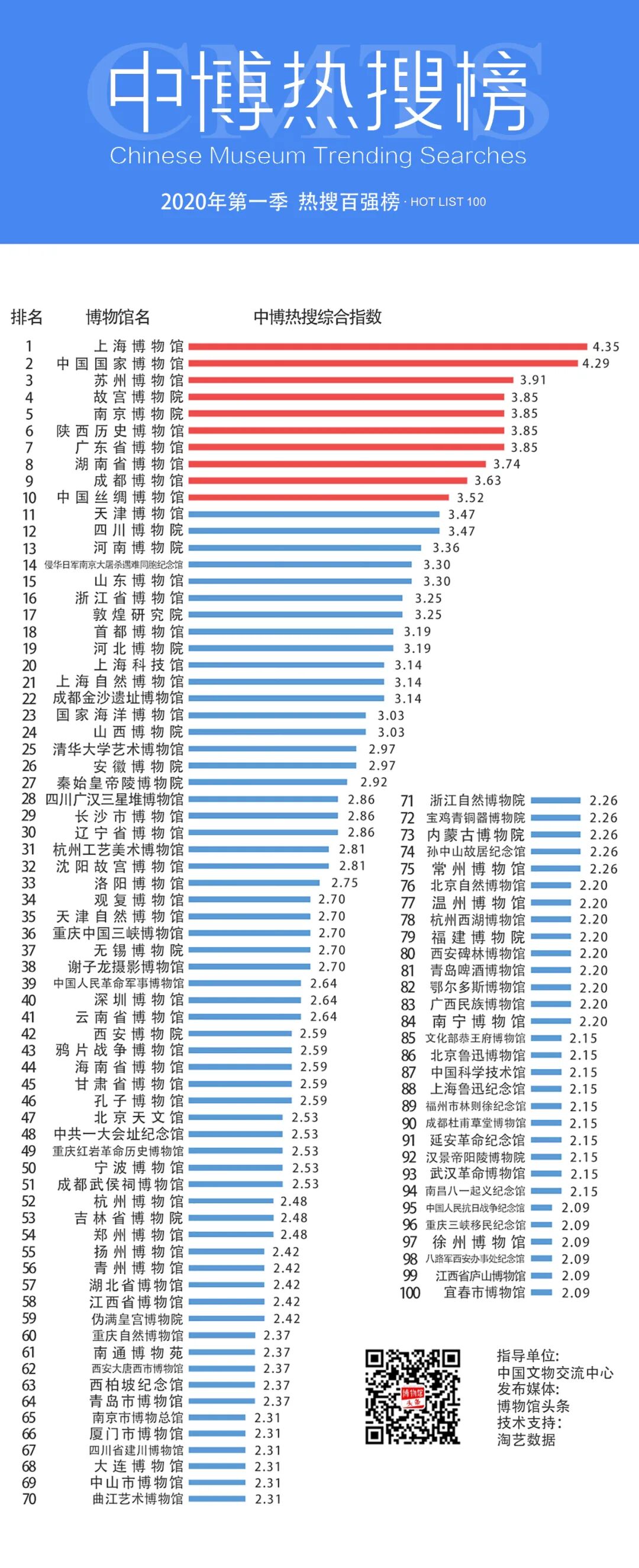 博物馆头条讯:首期“中国博物馆热搜榜”五个榜单今日正式发布,全国100个博物馆的“全网热搜”指数首次公布。中国博物馆热搜榜(简称中博热搜榜,CMTS)是中国博物馆领域首个综合性“热度”推介榜单,在中国文物交流中心的指导、支持下,由“博物馆头条”通过专业品牌监测系统作为大数据分析支撑,长期对全国备案博物馆举办公开展览的传播情况和公众反馈信息进行采集、统计和发布。活动以公开性事实信息为依托,属于公益性博物馆及展览品牌推广发布。