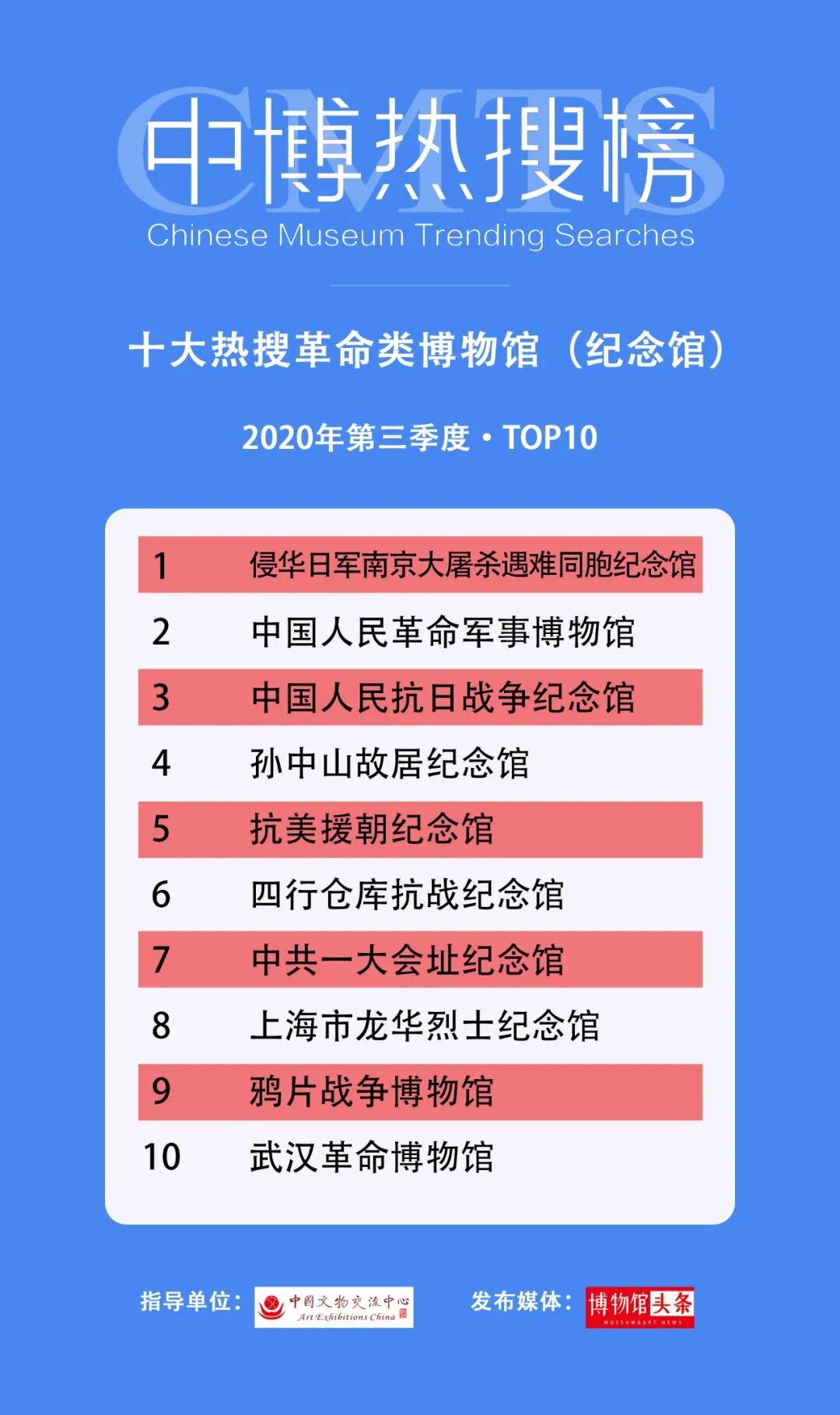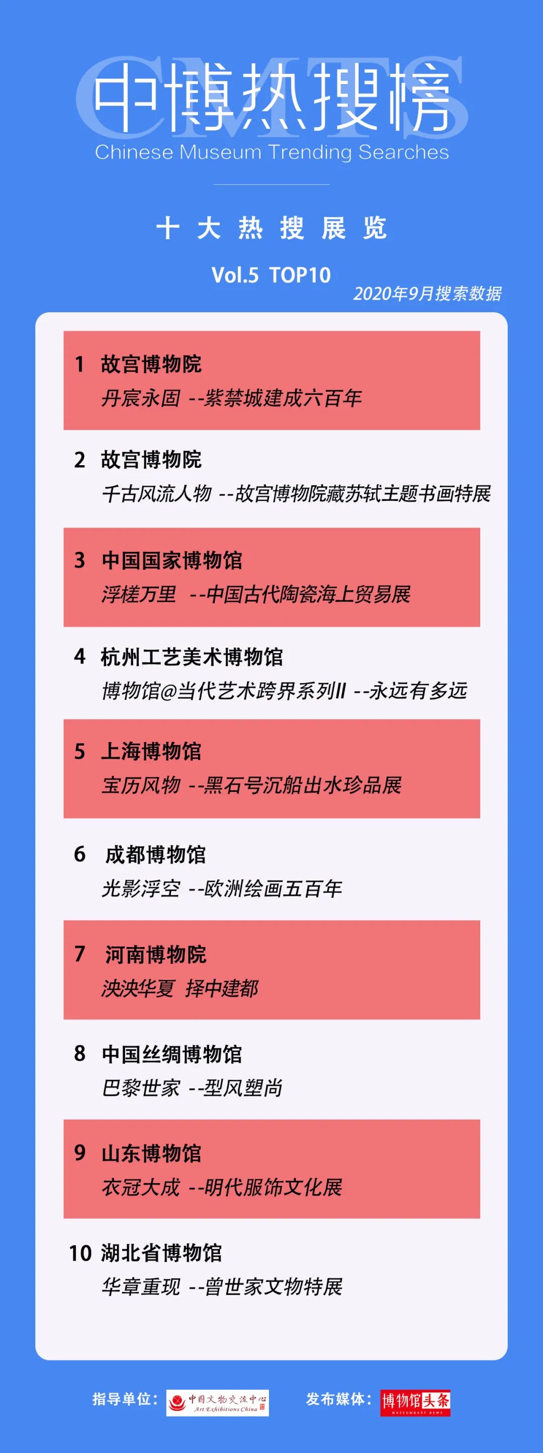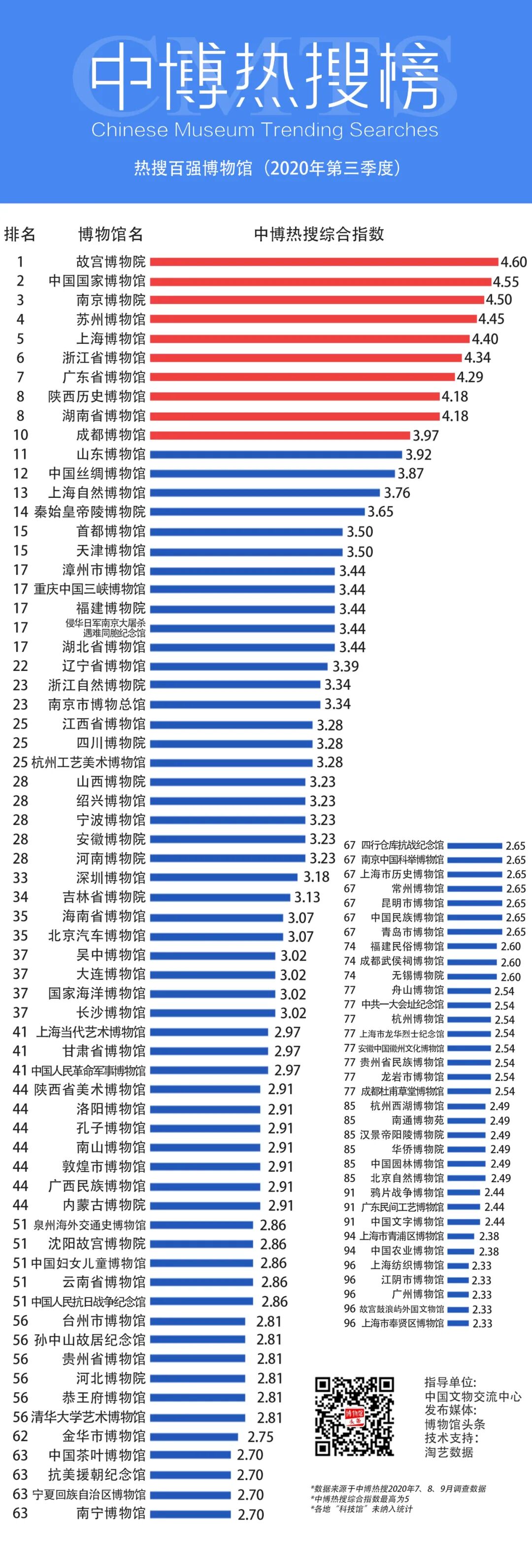 博物馆头条讯:由中国文物交流中心指导,博物馆头条发布的第五期“中博热搜榜”今天发榜,本期榜单发布5个季度热搜榜单和31个区域榜单。季度榜单包括2020年第三季度全国热搜博物馆百强、季度“⼗⼤热搜博物馆”“⼗⼤热搜展览(推介)”“⼗⼤热搜⾰命类博物馆(纪念馆)”“⼗⼤热搜⾃然类博物馆”。区域榜单为各省市9月份十大热搜博物馆。