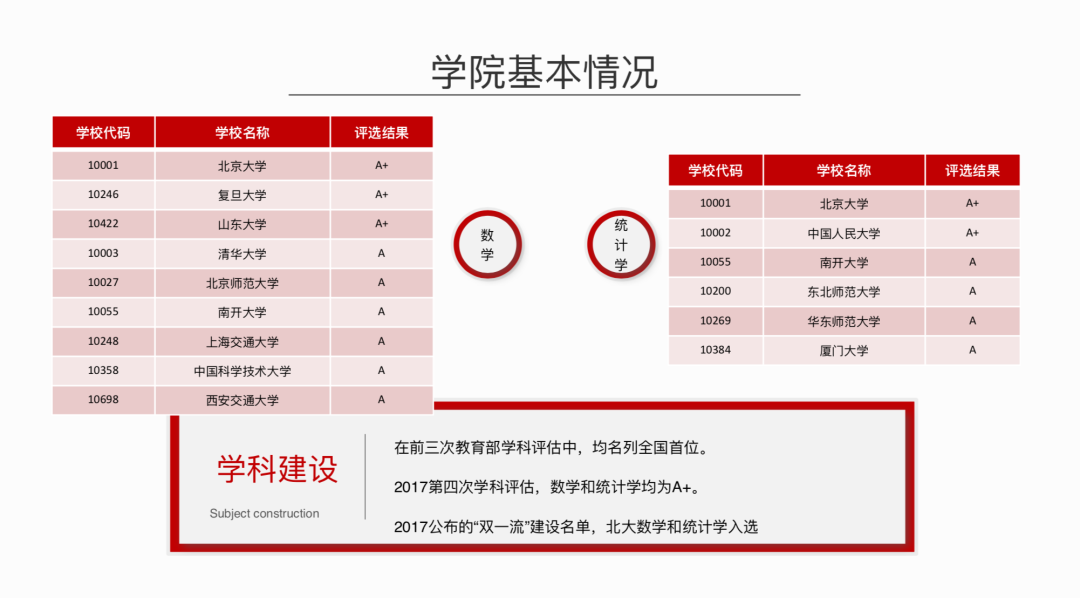 在前三次教育部学科评估中,北大数院均名列全国首位。在2017年的第四次学科评估中,数学专业和统计学专业均为A+,并入选“双一流”建设名单。