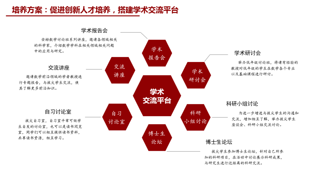 除了建设特色核心课程,导师制也是非常重要的一环。学院为学生配备专业导师,指导其进性本科生科研。列入导师制体系的教师均为学科资深专家以及数学各领域的活跃专家。学院组织科研宣传会、科研汇报会、讨论班、师生交流会等各类科研活动,培养学生的科研能力。