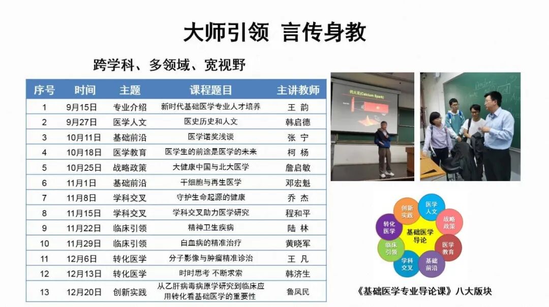 在早期导论课中,邀请国内外、大学本部、医学部及临床医院各个领域的杰出代表,对基础医学的内涵和外延、交叉学科对医学发展及人类健康的推动作用进行介绍,使学生全方位、多视角认识基础医学专业学科现状及未来发展,培育学生的家国情怀,增强使命感和责任感,激发学习兴趣和远大志向。