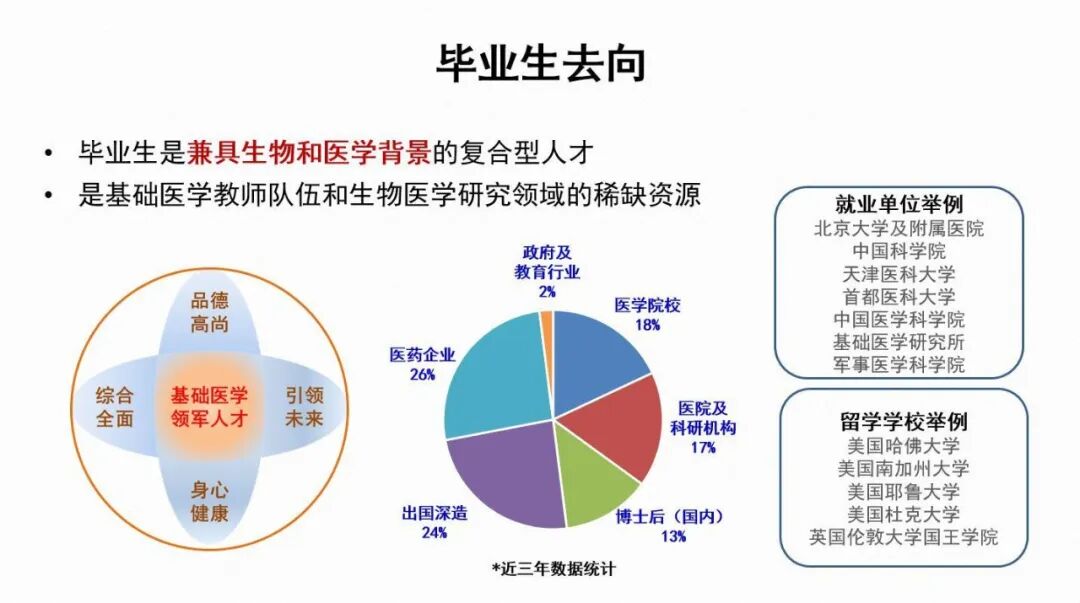 就业单位如北京大学及附属医院、中国科学院等;留学学校如哈佛大学、耶鲁大学、杜克大学等。