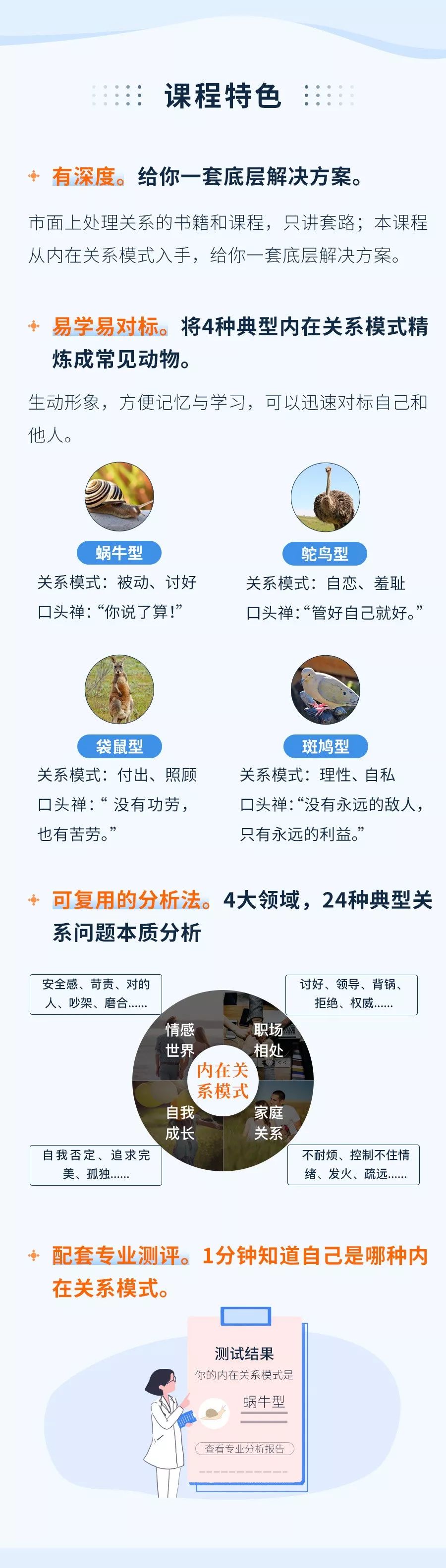 突然明白了我跟我丈夫之间剑拔弩张的关系,两只鸵鸟型的人在一起相爱相杀,各自的关系模式不同,导致了很多误会。之前,我都是没有任何感触的。 以前特别害怕跟领导沟通,就算有不懂的问题,也不会问,往往到最后才发现捅了大篓子。理解了自身的关系模式后,我发现内心的恐惧和阻碍竟然慢慢变少了。 我的妈妈就是袋鼠型,以前一直不理解,为什么她总是跟我们抱怨自己很辛苦很累,又不让我们插手,导致关系很紧张,现在终于找到了跟妈妈相处的方法。