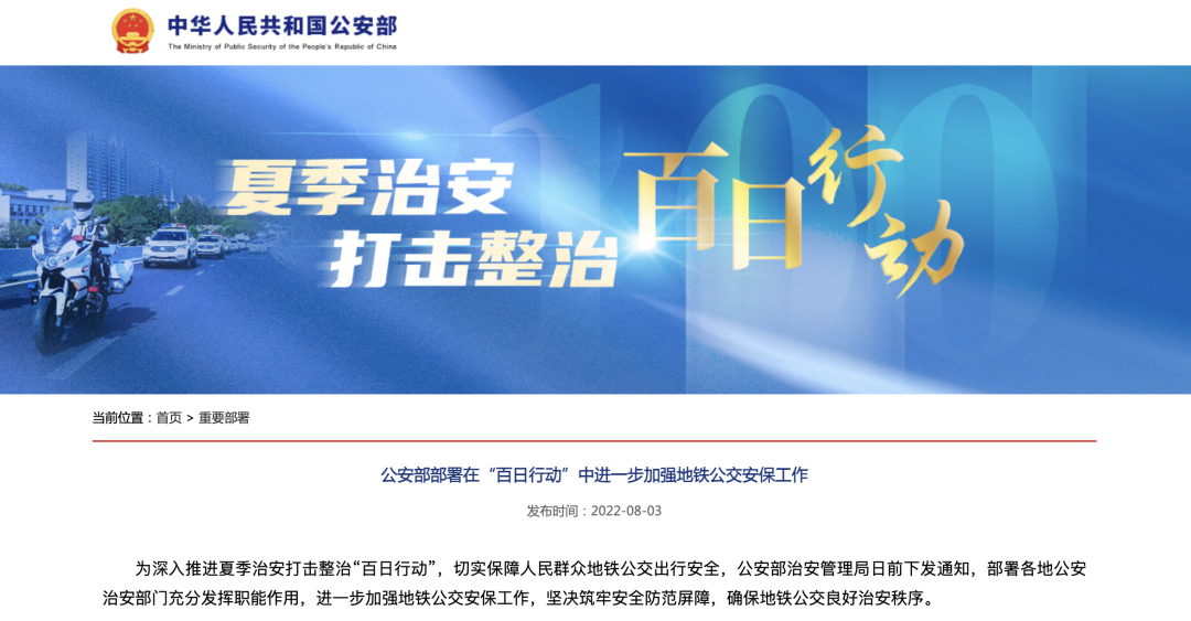日前,公安部治安管理局下发通知,部署各地公安治安部门进一步加强地铁公交安保工作,坚决筑牢安全防范屏障,确保地铁公交良好治安秩序,深入推进夏季治安打击整治“百日行动”,切实保障人民群众地铁公交出行安全。