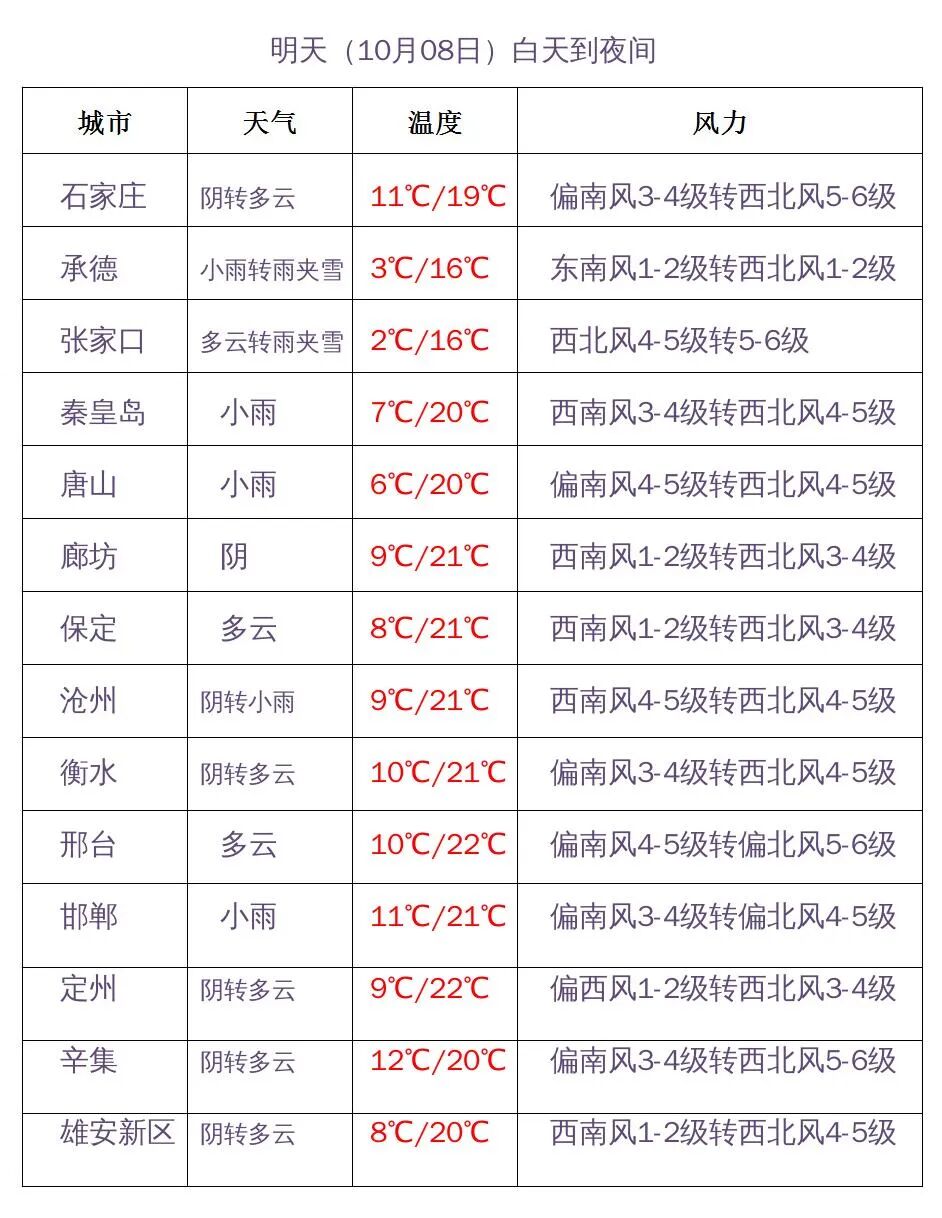 明天夜间到9日,张家口北部、承德阴有小雪,局地有中雪,唐山、秦皇岛、廊坊北部阴有小雨,局地有中雨,其他地区多云。