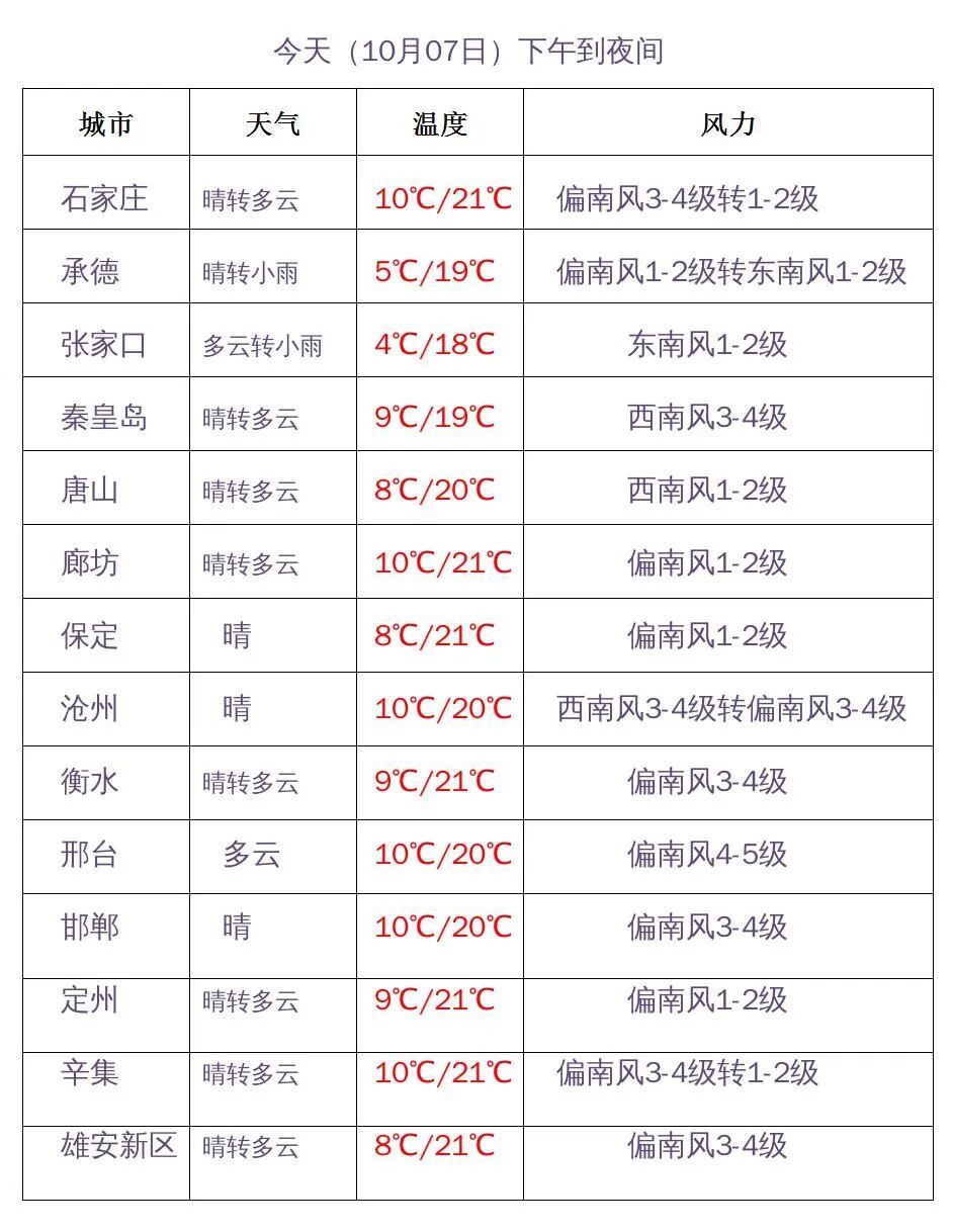 今天下午到夜间,张家口、承德多云转阴有小雨,其他地区晴转多云。