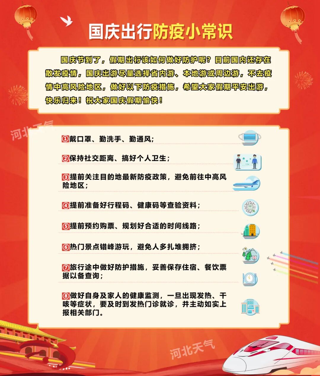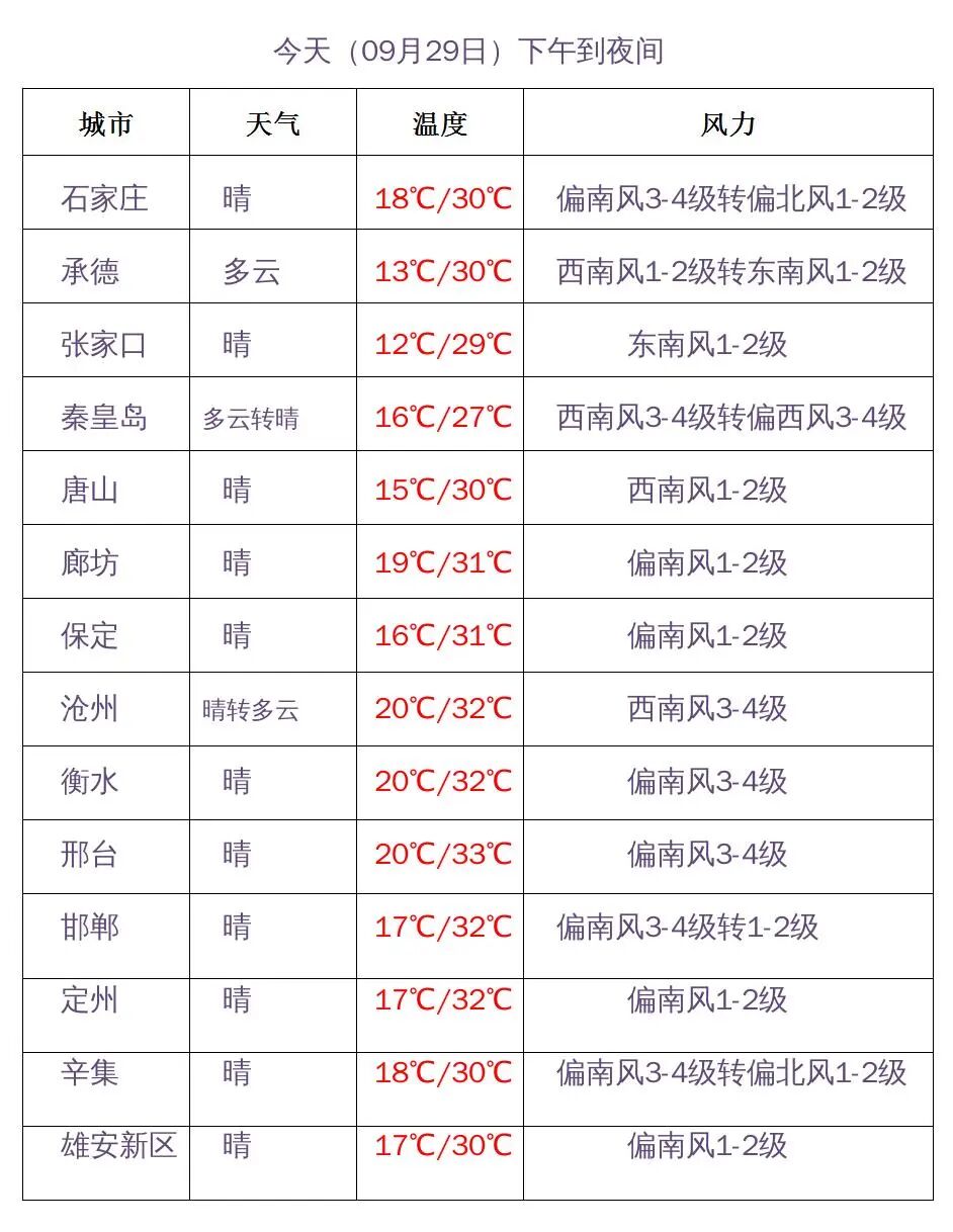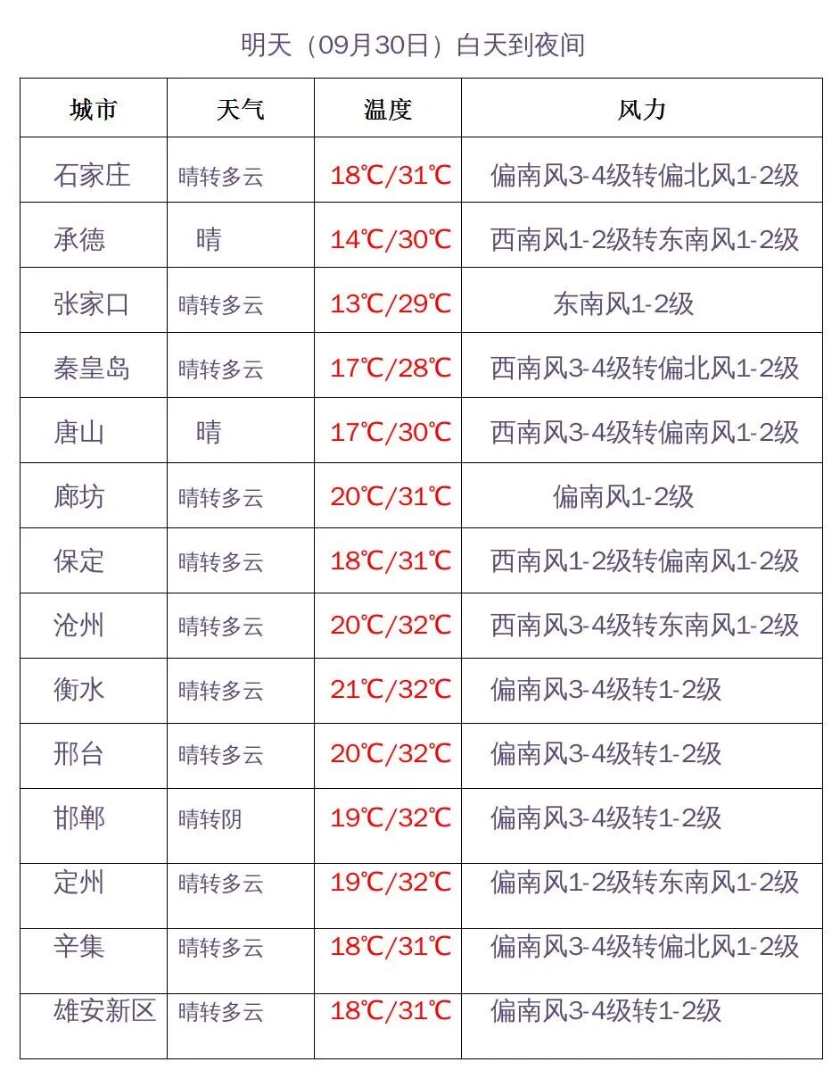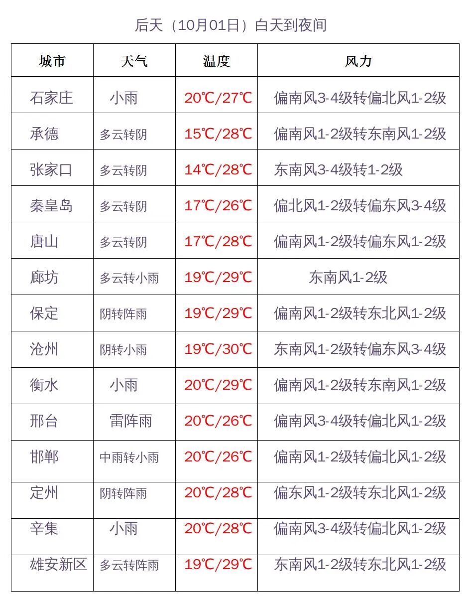 10月1日白天到夜间,石家庄南部、衡水、邢台、邯郸有雷阵雨或阵雨,其中邢台、邯郸局地有中到大雨,个别地点可能有暴雨,其他地区多云间阴。