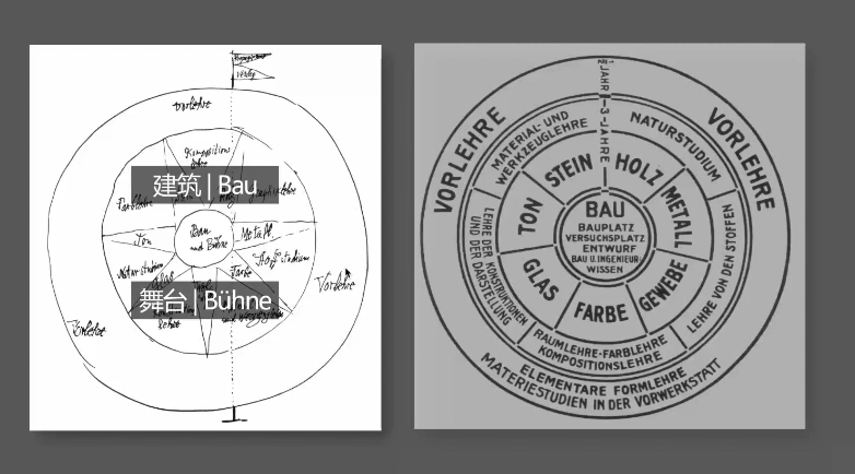 理念结构图是包豪斯的第三个重要意象。周诗岩教授指出包豪斯官方发布的理念结构图是以共同建筑为核心点,保罗·克利的建筑与舞台的两个中心点概念合二为一,使BAU具有更深层的意义,即吸纳了出版、舞台和展示的总体建筑。