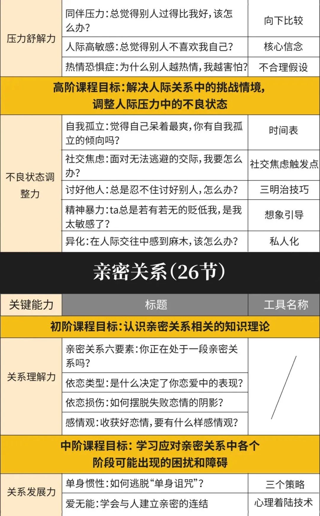 针对每个人生议题,建立符合系统学习的心理规律的3阶成长体系:初阶助你掌握心理学基础知识,中阶助你培养心理能力,高阶代入真实案例和情境。让你从理解问题背后的深层原因,到学习应对问题的方法,最后能够主动对问题进行调整。渐进式学习,从中发现自我改变的潜力,搭建起系统全面的自我成长体系。丨一套科学实用的行动指南