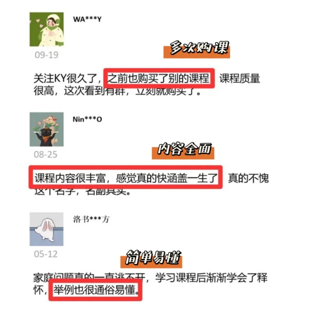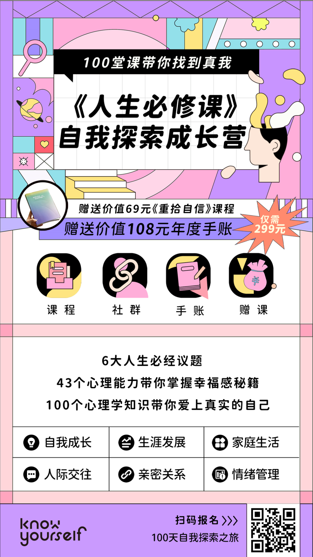 从咱们《人生必修课》上线到现在,已有超5000用户完成了课程学习,课程结束,99.8%的学员反馈学完对个人成长、自我认知、亲密关系的理解有了明显改善,收获了无数宝贵的好评和反馈。最后说到价格,用咱们老板钱庄小姐姐的话来说,我们的《100堂人生必修课》基本是目前市面上性价比最高的心理学底层课程。市面上500以内的自我提升类课程,大多只有短短十几节课,并且只能覆盖到1-2个知识体系。而KY这门「人生必修课」,一次性为你提供系统的100节课,覆盖人生最重要的6大主题,依然只要299元。并且,现在报名,前200名再送价值69元的KY热门好课《重拾自信》,以及价值108元的KY新品《2023年度手账》。这里必须值得一提的是,KY的年度手账一直是每年最为抢手的周边。今年我们以《情绪漫步》为主题,希望在历经2022年的艰辛迷茫后,2023年的你能更加自由掌控自我的情绪。这与咱们《人生必修课》中情绪主题的初衷不谋而合,也因此我们几经周折为大家特别申请了200份,赠完就真的没有了,小伙伴们闭眼入绝对不亏。🎁价值108元KY年度手账+价值69元《重拾自信》课程A:扫描海报上的二维码/点击阅读原文→下单订阅课程→添加专属小管家→加入专属VIP训练营。A:购课成功后,即买即可听课,课程有效期为一年,详情可联系您的专属小管家。A:VIP训练营营期为100天,提供课程打卡提醒,打卡心得交流,话题讨论,直播答疑,每日能量补给等服务。