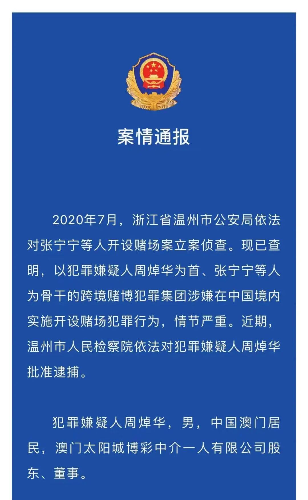 2020年7月,浙江省温州市公安局依法对张宁宁等人开设赌场案立案侦查。以犯罪嫌疑人周焯华为首、张宁宁等人为骨干的跨境赌博犯罪集团涉嫌在中国境内实施开设赌场犯罪行为,情节严重。