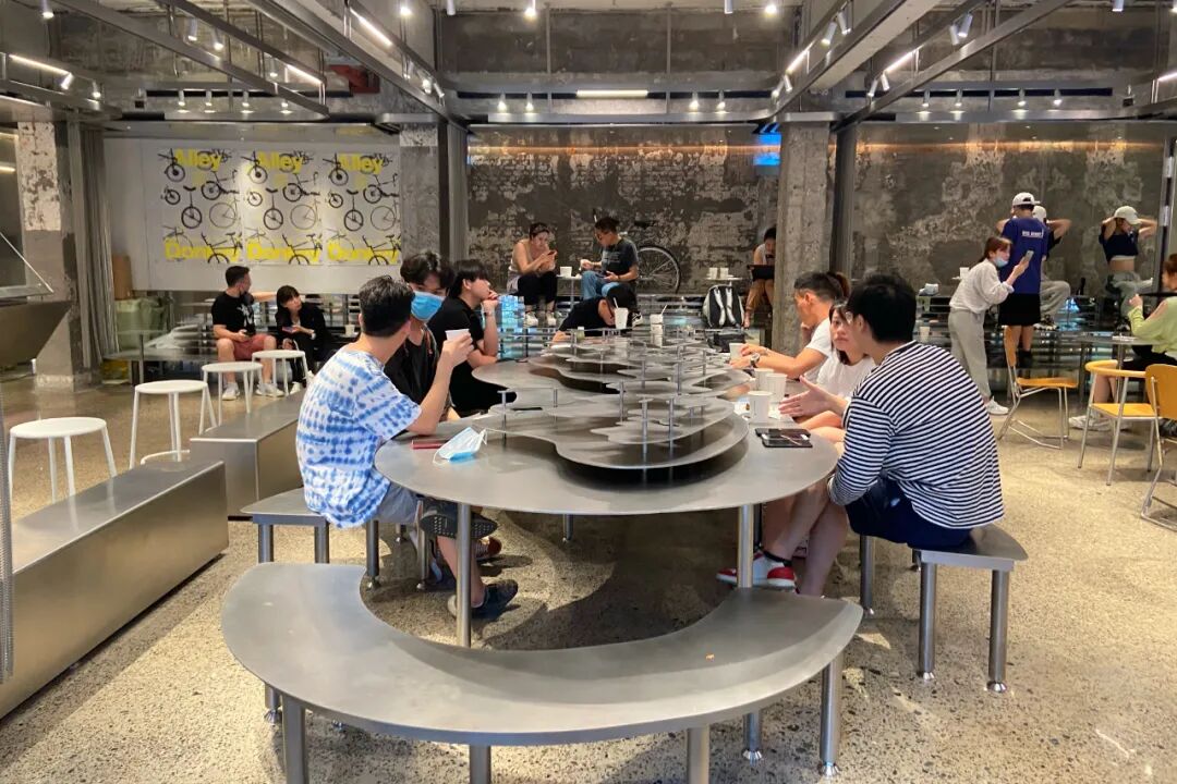 餐品方面有咖啡、面包、甜品等提供;堂食区分有不同区域,最特别的是置于店中心的大会客桌,以等高线为设计理念,由不规则的不锈钢板层层堆叠,在视觉上形成高低不一的感觉。