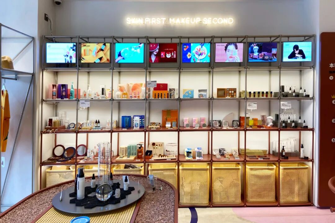 一层分有三个部分,左半边集合了各种美妆产品,琳琅满目,护肤品、彩妆、香氛产品等一应俱全。店内还有一面Judy Doll橘朵眼影墙,是必打卡的场景之一。