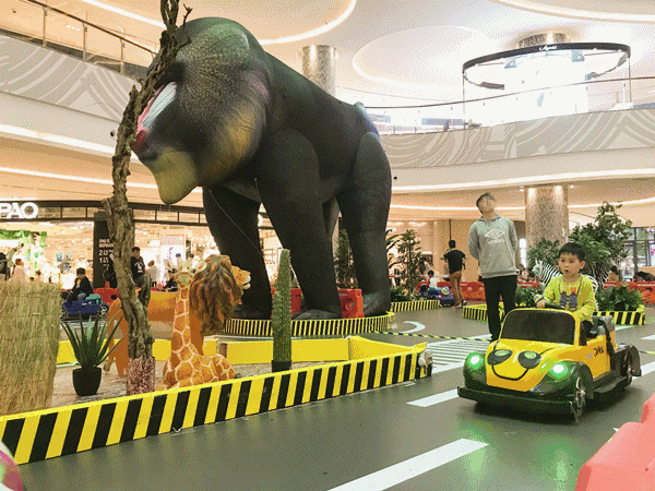5月14日至6月16日,商场打造了一个“赛车动物城”,现场有狒狒、斑马、火烈鸟等各种动物造型,并在其中举办“车神挑战赛”,非常有趣。