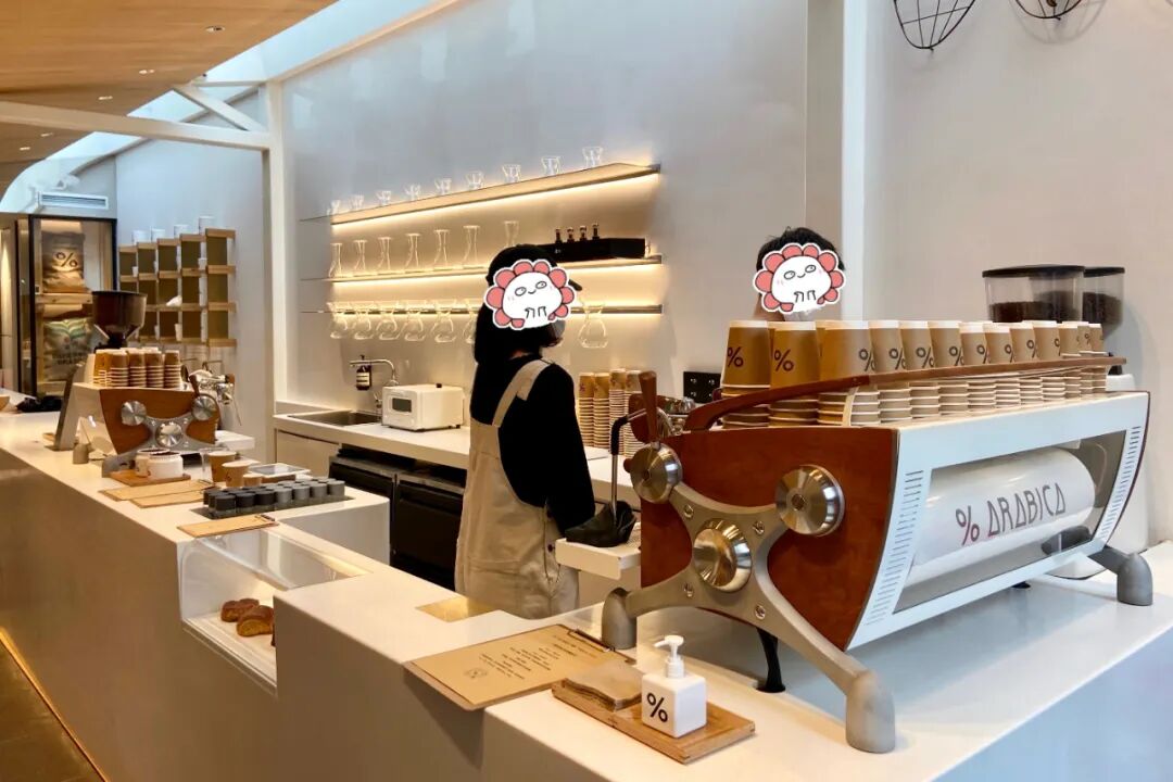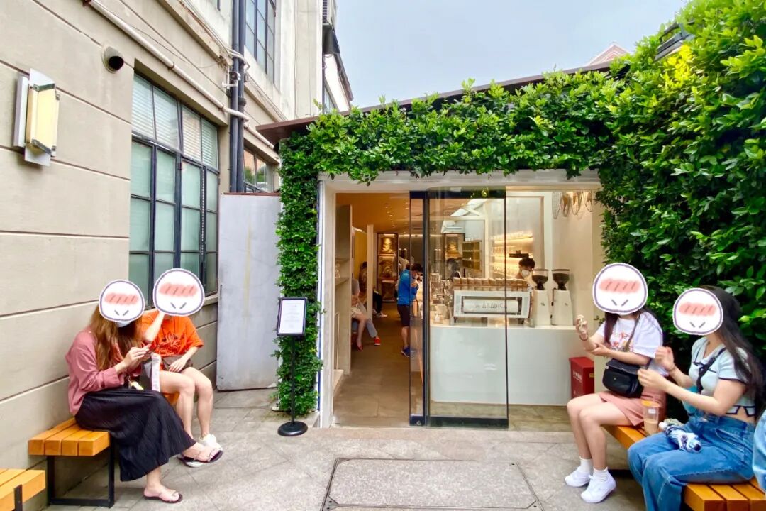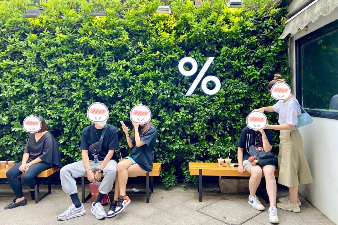 %Arabica上海首店也选址武康庭,穿过一条走廊,入眼先看到一面绿植墙,上面挂着标志性的“%”,绿植墙前有几个木质长凳,有一些顾客坐在长凳上聊天、拍照。