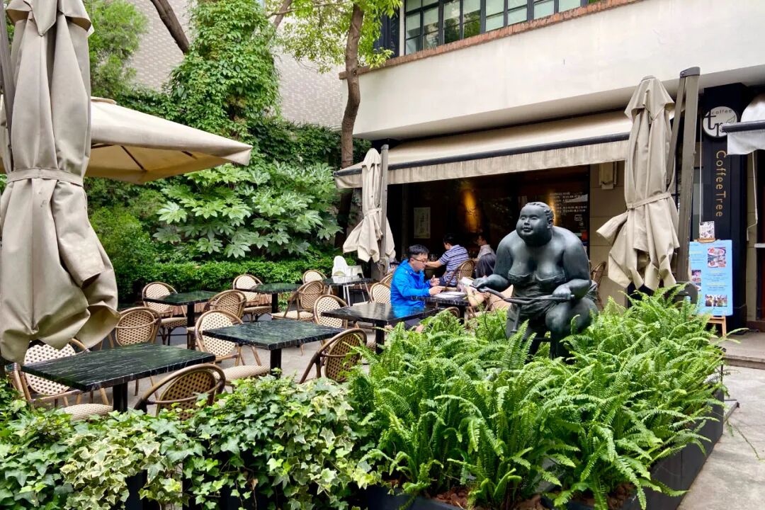 378号2层有一家龙门阵茶屋川菜馆,之前在东湖路上,人气一直很旺。往里走可以看到武康庭标志性的雕塑作品:骑着自行车充满自信的BoBo girl,旁边是Coffee Tree、a cote等热门餐厅。
