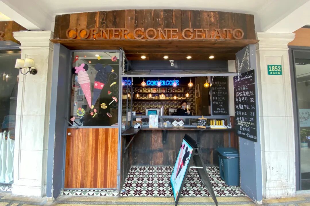 CORNER CONE GELATO酷矿手作霜淇淋位于老麦咖啡馆后门一旁(沿淮海中路)。酷矿的门店面积很小,只有点单窗口,没有规划堂食区。装修和老麦一样都是复古工业风,有黑白格纹的墙壁、做旧木质元素、钢制门框和窗框等。