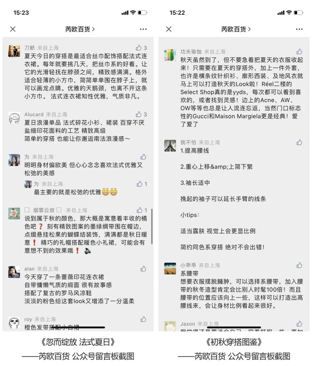 芮欧百货在谈及项目主要消费客群画像时,“个性”、“潮流尖端”、“时髦”等成为高频出现的词语。这一点在翻看芮欧百货公众号时,消费者的信息量满满的留言让我们有了直观感受:果然对穿搭很有独到见解。