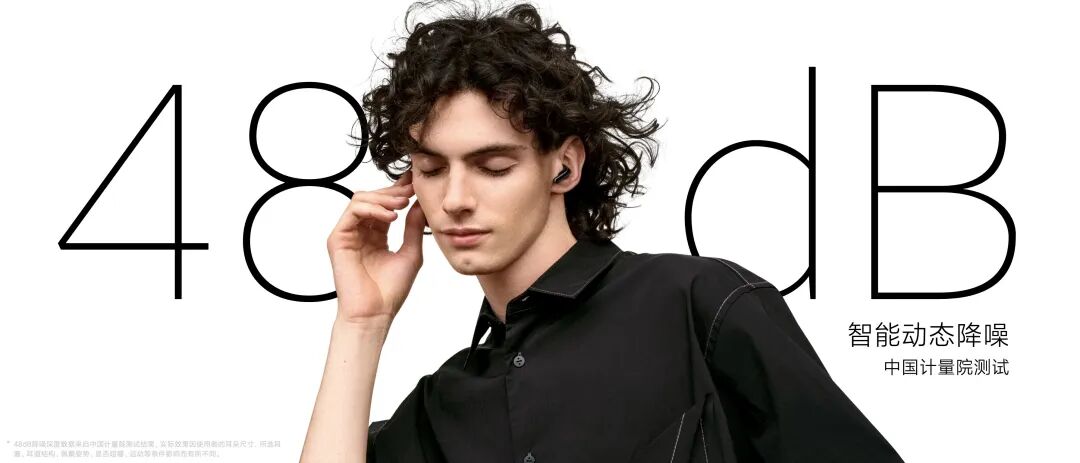 *48dB降噪深度数据来自中国计量院测试结果,实际效果因使用者的耳朵尺寸、所选耳塞、耳道结构、佩戴姿势、是否咀嚼、运动等条件影响而有所不同。
